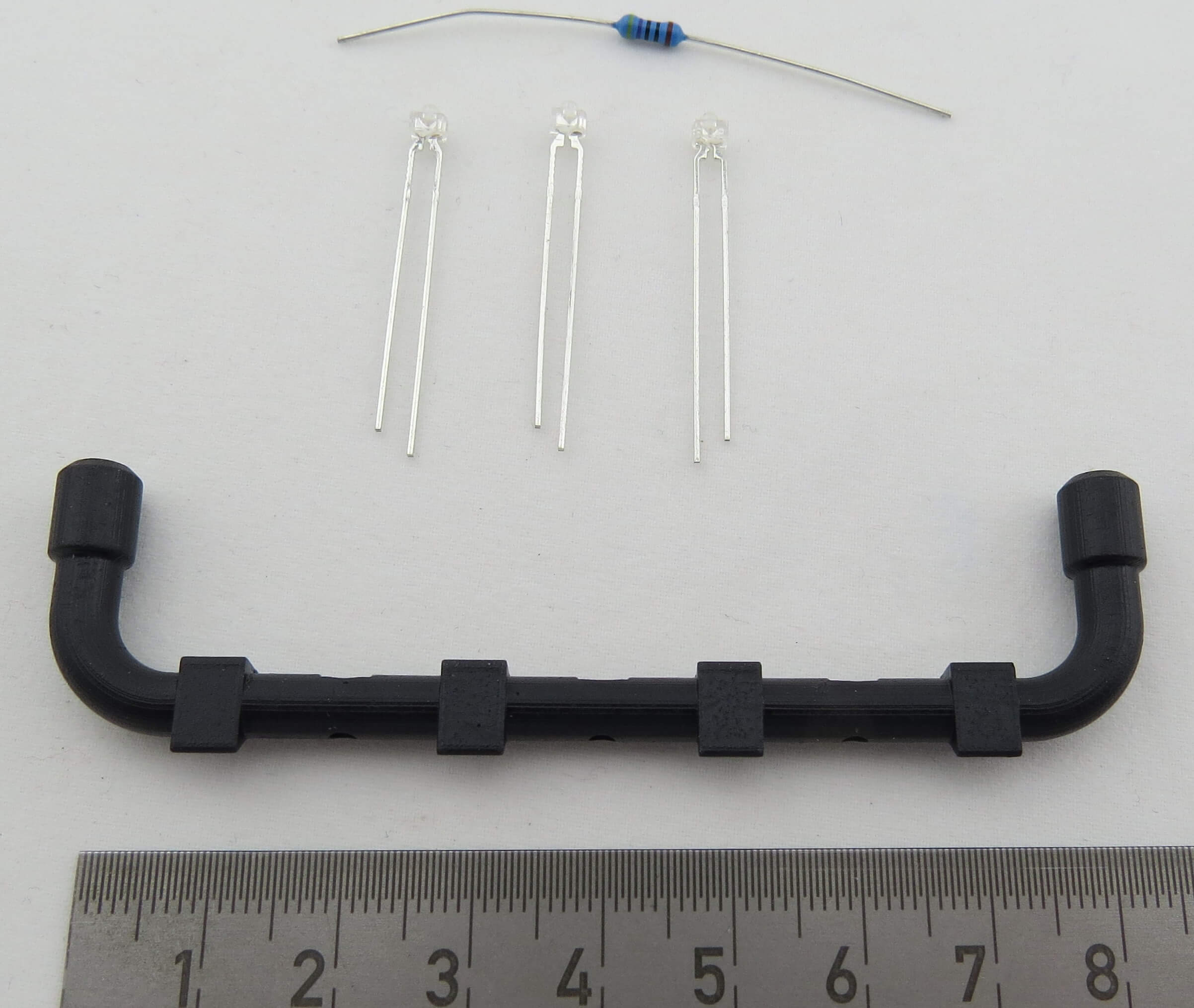 1x Mini-Bar für ACTROS (Tamiya), schwarz Material: ABS 3D-Druck. Es sind noch leichte Schleifarbeiten notwendig. 1x MiniBar, 3x LED weiß, hell, Vorwider- stand 4,7K. Alle LEDs 1,8mm.