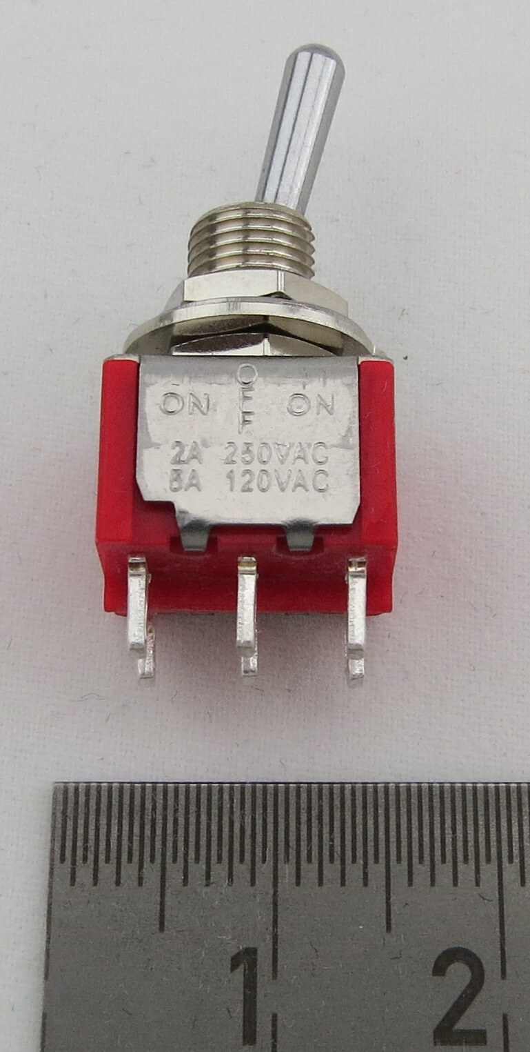 1x Miniatur-Kippschalter 2x UM (2-polig) 2x UM, schaltend mit Mittelstellung Q11, 120V, 5A, RM5 Lötmontage. Raststellungen (EIN-AUS-EIN).