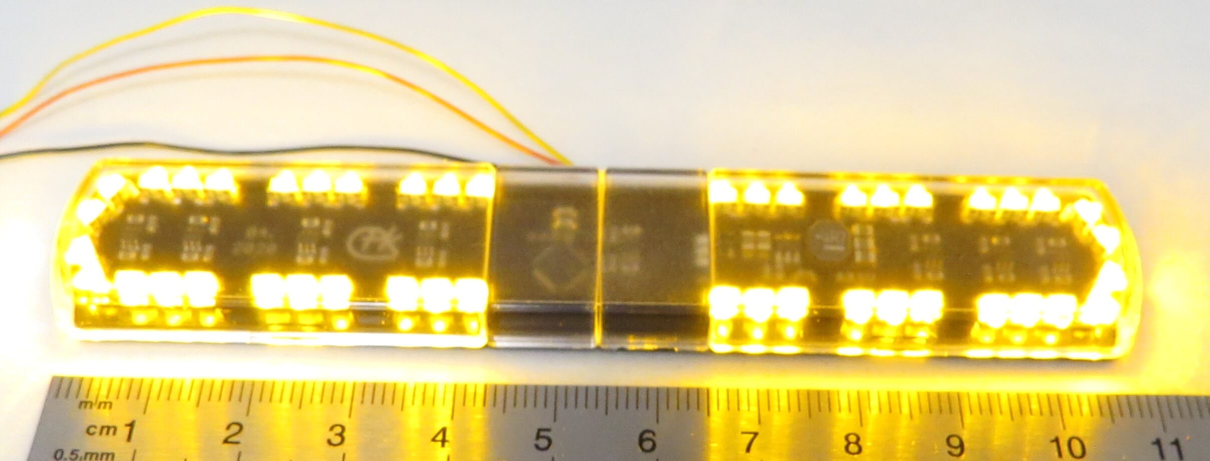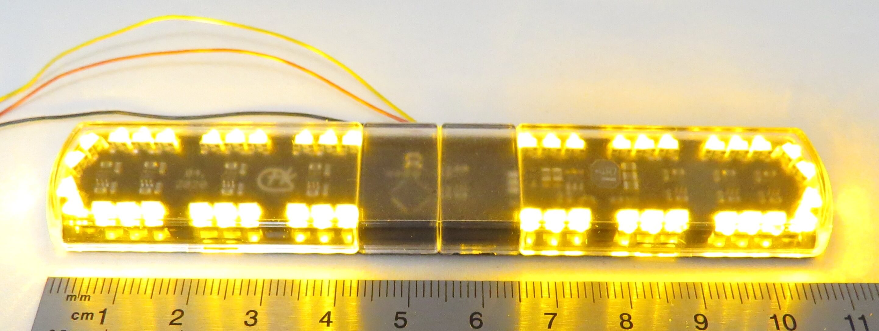 1x Rundumleuchtbalken, mit integrierter Elektronik u.SMD-LEDs, GELB, 5-14V, Maßstab passend zu 1:16 und 1:14 - also Wedico und Tamiya. Es stehend 33 wählbare Blinkmuster zur Verfügung.