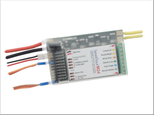 Servonaut M24 Fahrtregler mit Licht- anlage für Trucks und Funktionsmodelle/ Fahrzeuge. Fahrtregler für 7,2 bis 12V und 20A/5 min. bei 16 oder 32 kHz Takt- frequenz, BEC 5,3V/4A, Lichtanlage mit 6 Schaltausgängen je 700mA, incl. Anleitung, Maße ca. 43x13x80mm. Für konventionelle Motoren und Glockenankermotoren gleichermaßen geeignet.