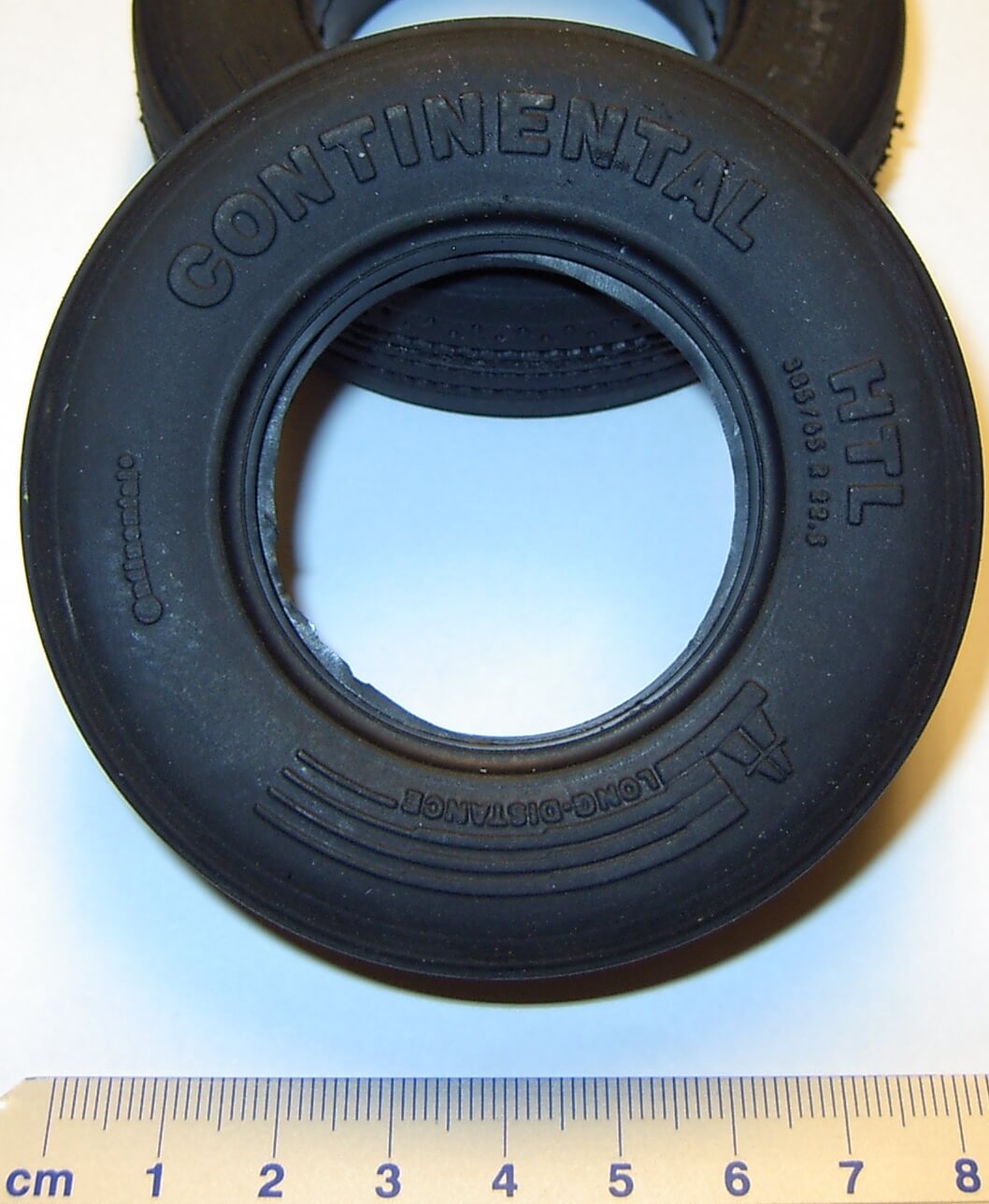 1x Strassen-Breitreifen Vollmaterial, CONTI 385/65R22,5.Außen 82mm,innen 43mm, Breite 27mm. HTL. LONG-DISTANCE. Tamiya-Größe! 1 Stück.