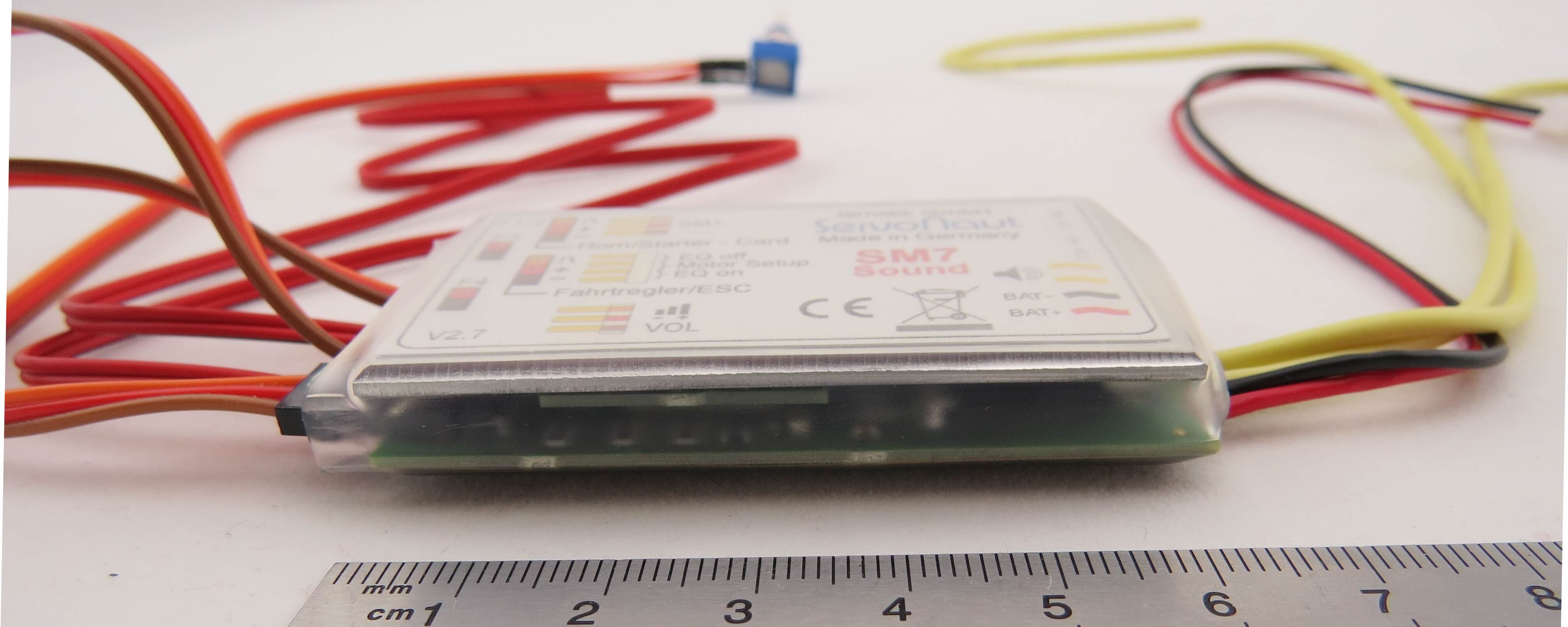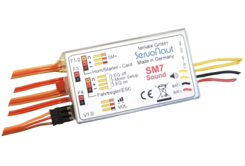 Soundmodul für Truck-Modelle - Nachfolger des bewährten SMX, deutlich verkleinert Dynamischer Turbolader-Sound der Extraklasse - noch näher am Original Fahrsituationsabhängiger Motorklang mit Turbolader Zündung, Anlasser- und Abstellgeräusch, Rückfahrwarnton 5 Truck-Fanfaren, Druckluftgeräusche, Martinshorn 5 Motoren: Actros V6, Scania V8, TGA Reihen-Zylinder, DAF Reihen 6-Zylinder, Scania Reihen 6-Zylinder Mehrkanalige Klangsynthese Turbolader, Druckluft, Warnton und Schaltgeräusche in der Lautstärke getrennt ein- und ausstellbar über Servonaut CARD (als Zubehör erhältlich) Schaltgeräusche und Warnton mit K15/30/40/60, Rückfahrwarnton und bremssynchrone Druckluft auch mit M20+/M24 und S20/S22 verfügbar, mit Fahrtreglern anderer Hersteller Funktion eingeschränkt Betätigung von Anlasser und Fanfare wahlweise über Schalteingänge (Multiswitch) oder einen Empfänger-Kanal Soundmodul direkt anschließbar an einen Neben- oder Stellmotor zur Simulation eines Nebenabtrieb-Geräusches Kleiner getrennter Lautstärkeregler ideal für die versteckte Montage am Modell Für 7,2V bis 12V Lautsprecher ab 4 Ohm Versorgung erfolgt aus dem Fahrakku Mit Akkustecker (passendes Gegenstück ist BECB) Kombinierbar mit SM+ für zusätzliche Sounds Optionaler Klangregler SM-EQ erhältlich als Zubehör Abmessungen ca. 65 mm x 35 mm x 12 mm