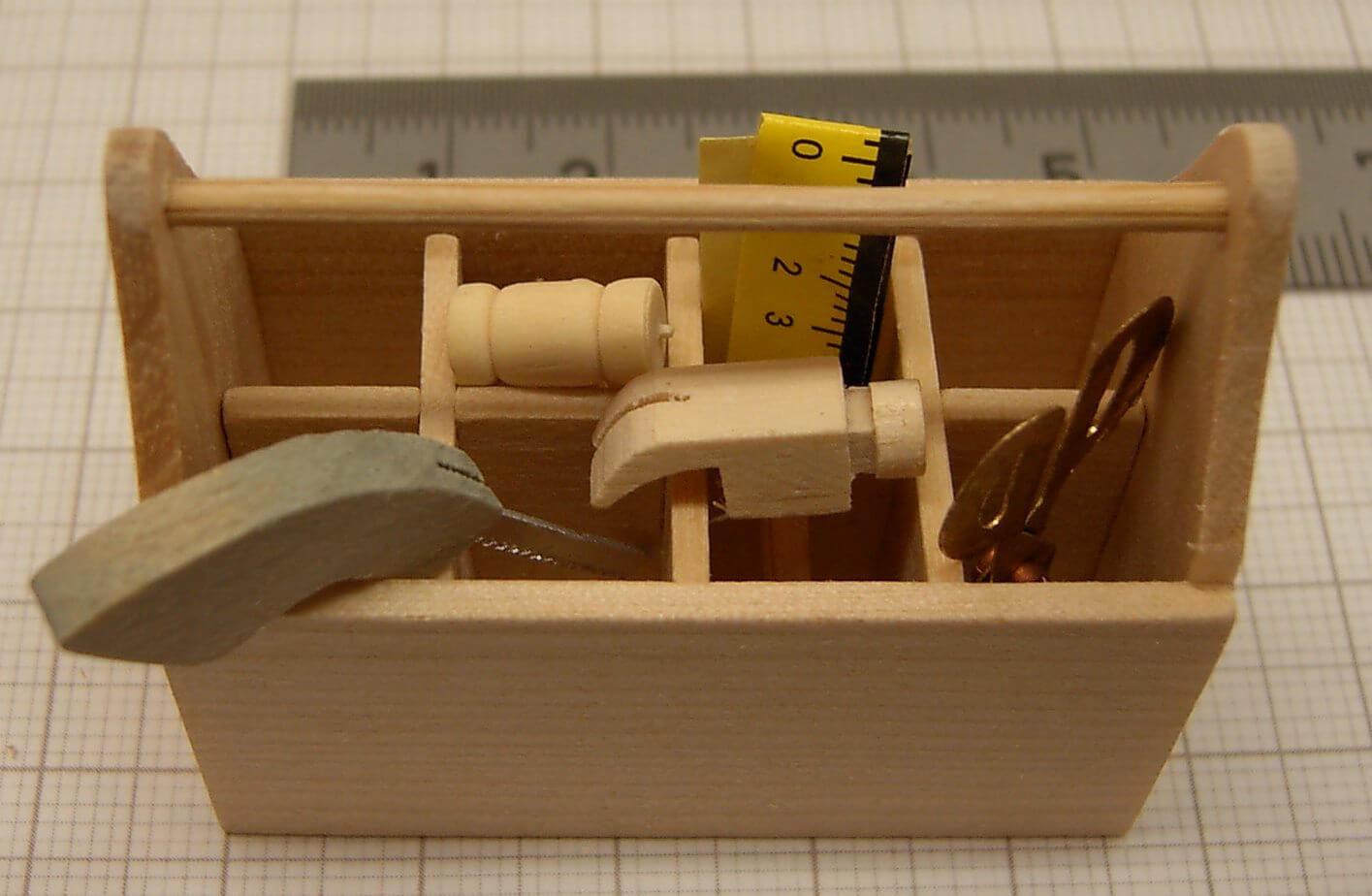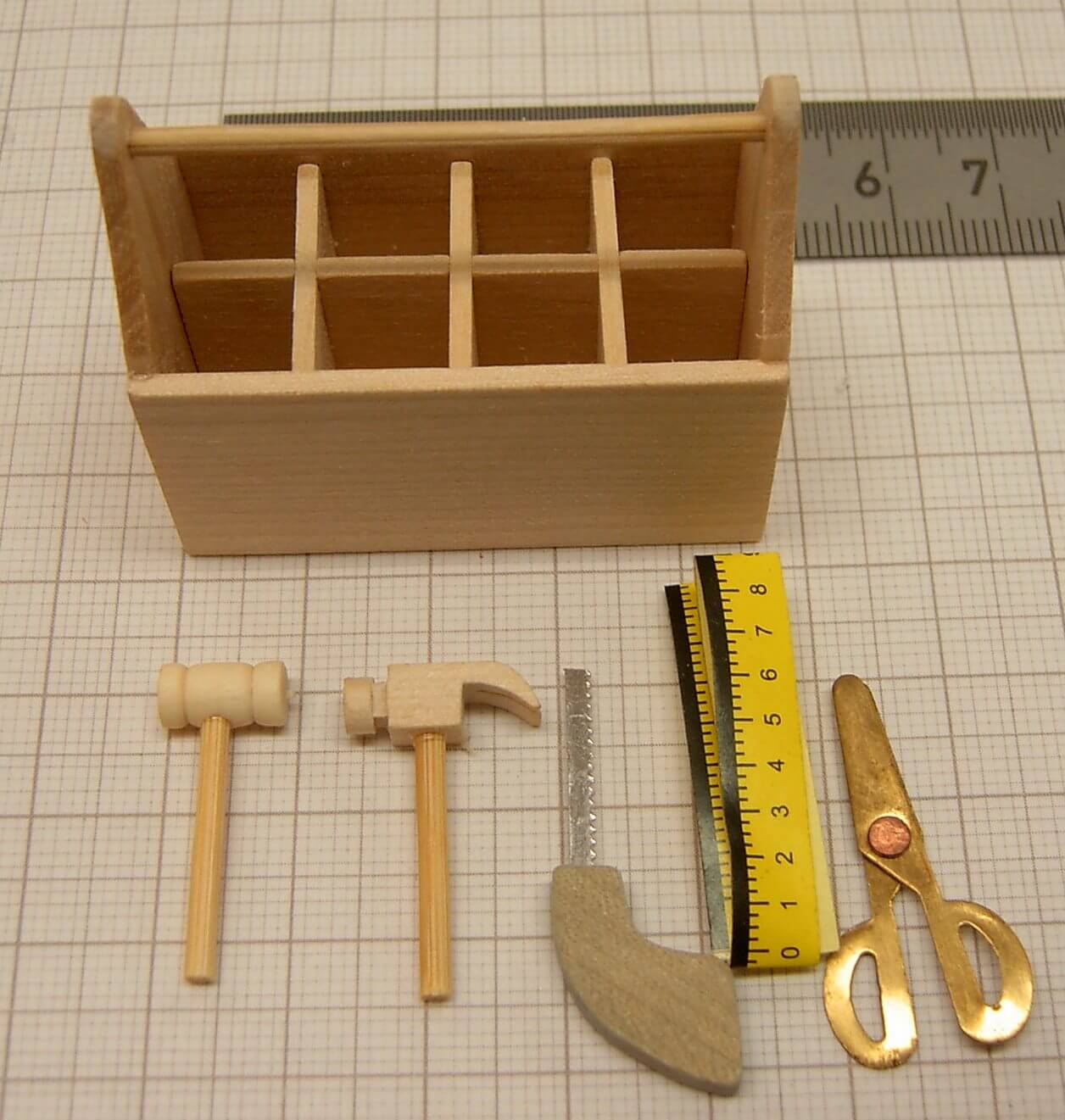 1x Werkzeugkiste 4,5cm lang, natur mit 5 Werkzeugen.