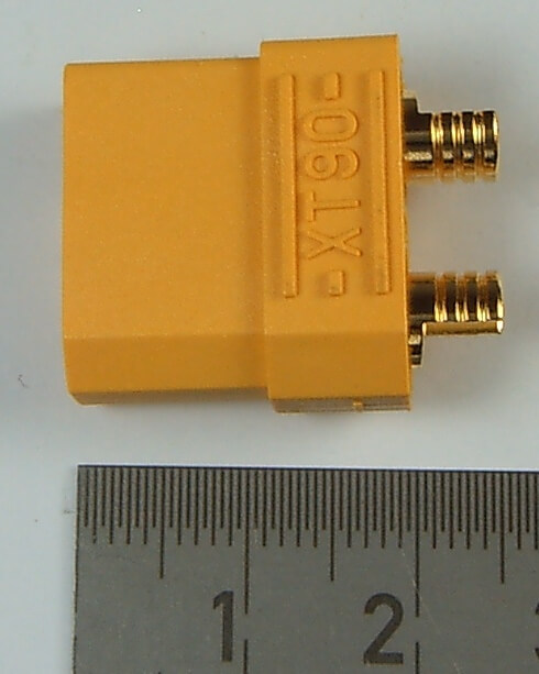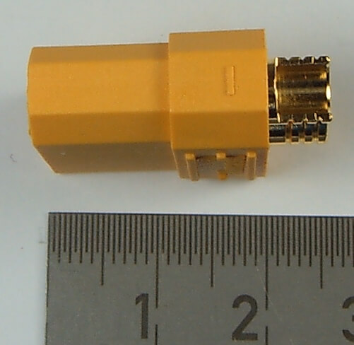 1x XT-90 Buchse. Gelbes Gehäuse.2 Pole. Belastbarkeit 2min: 90A. Ca. 25x21x11mm. Max. Kabelquerschnitt 9qmm.