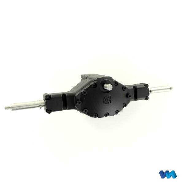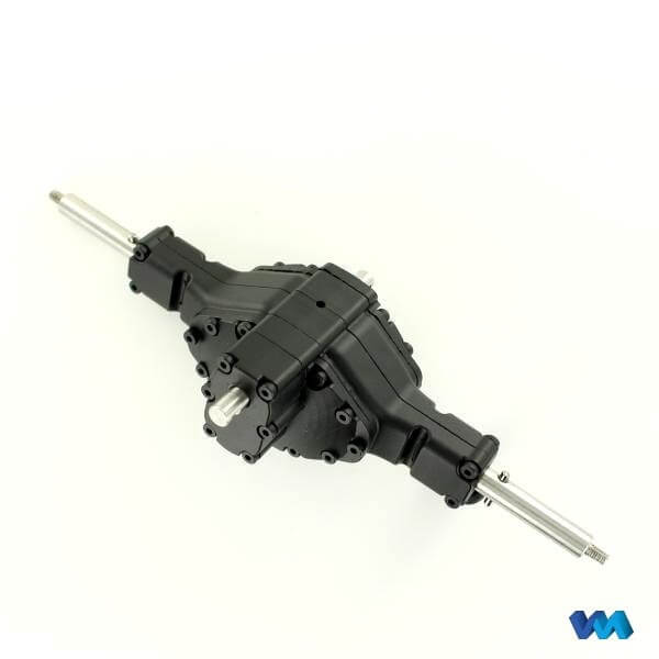 Die Achse ist mit einem selbstsperrenden Differenzial ausgestattet und kann sowohl mit und ohne Durchtrieb gebaut werden, es sind beide Wellen und Gehäusedeckel im Lieferumfang enthalten. Bei einem Traktionsverlust sperrt das Differenzial selbstständig/automatisch und generiert 100% Traktion. Ein großer Vorteil dieser Antriebsachse ist, dass KEINE Schaltservos, Bowdenzüge und Anlenkungen für die Differenzialsperren benötigt werden, dies kommt auch der Übersichtlichkeit und dem Platzangebot im Fahrgestell zugute. Die Achskomponenten sind in einem hochbelastbaren verstärkten Kunststoff-Achsgehäuse untergebracht. Des Weiteren kann die Hinterachse auch in Verbindung mit Schaltgetrieben verschiedener Hersteller betrieben werden.