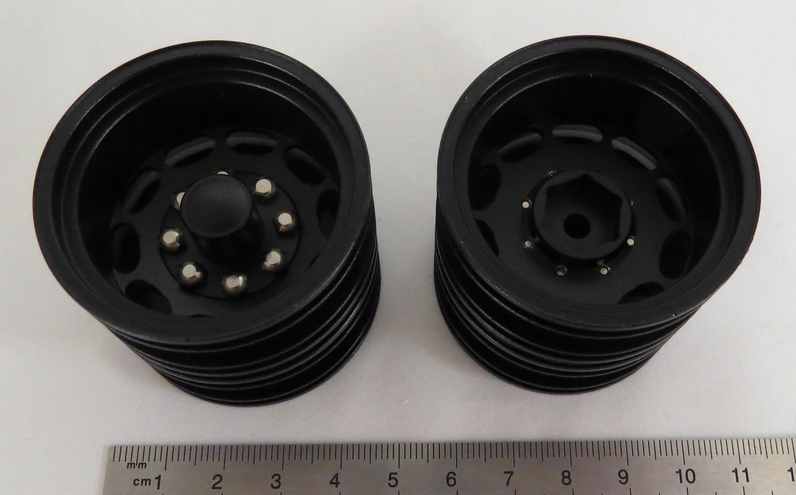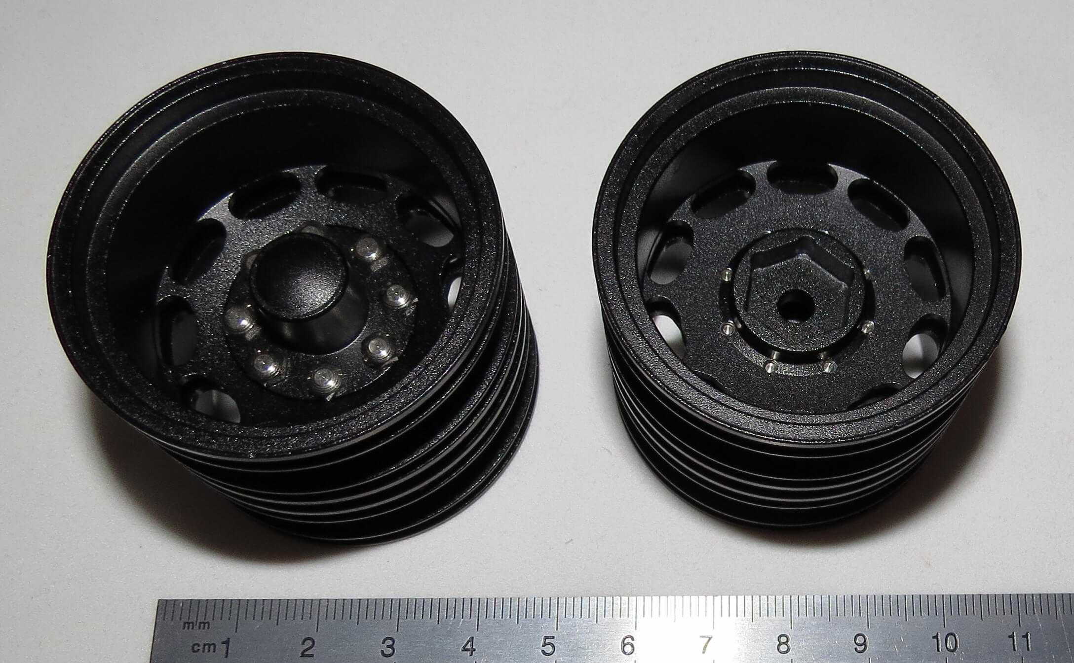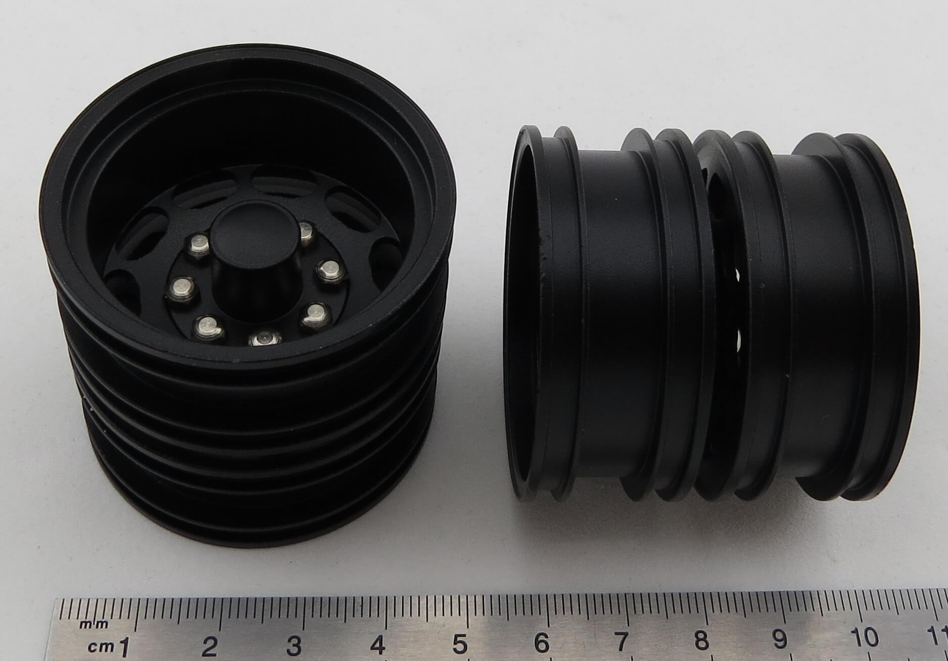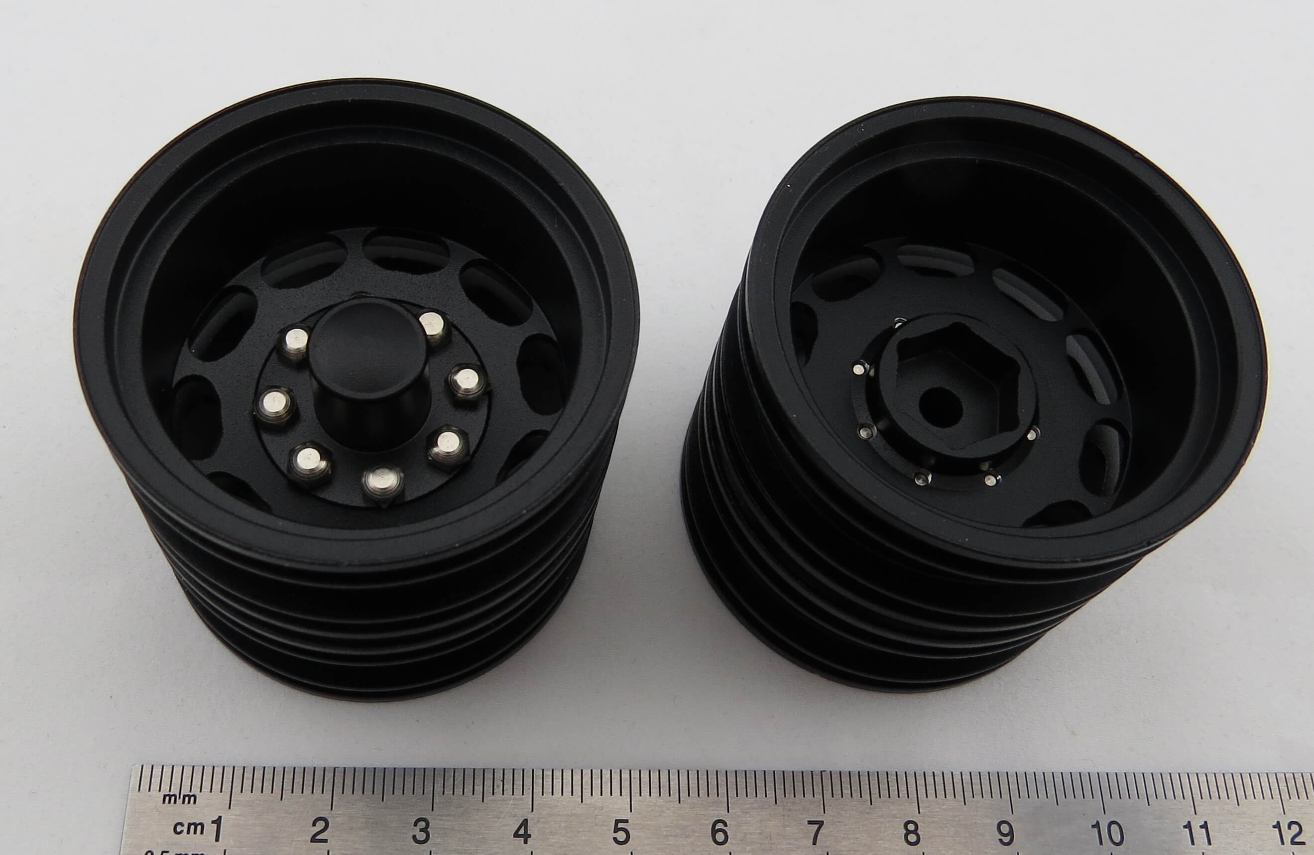 2 Felgen, Alu, schwarz, Triangel-Lochung für Antriebsachse.47mm Außendurchmesser. Breite 44mm. Nabenabdeckung mit 8 6-kant-Schrauben. Antrieb über Innen- sechskant SW12. Tamiya. Zwillingsfelgen.