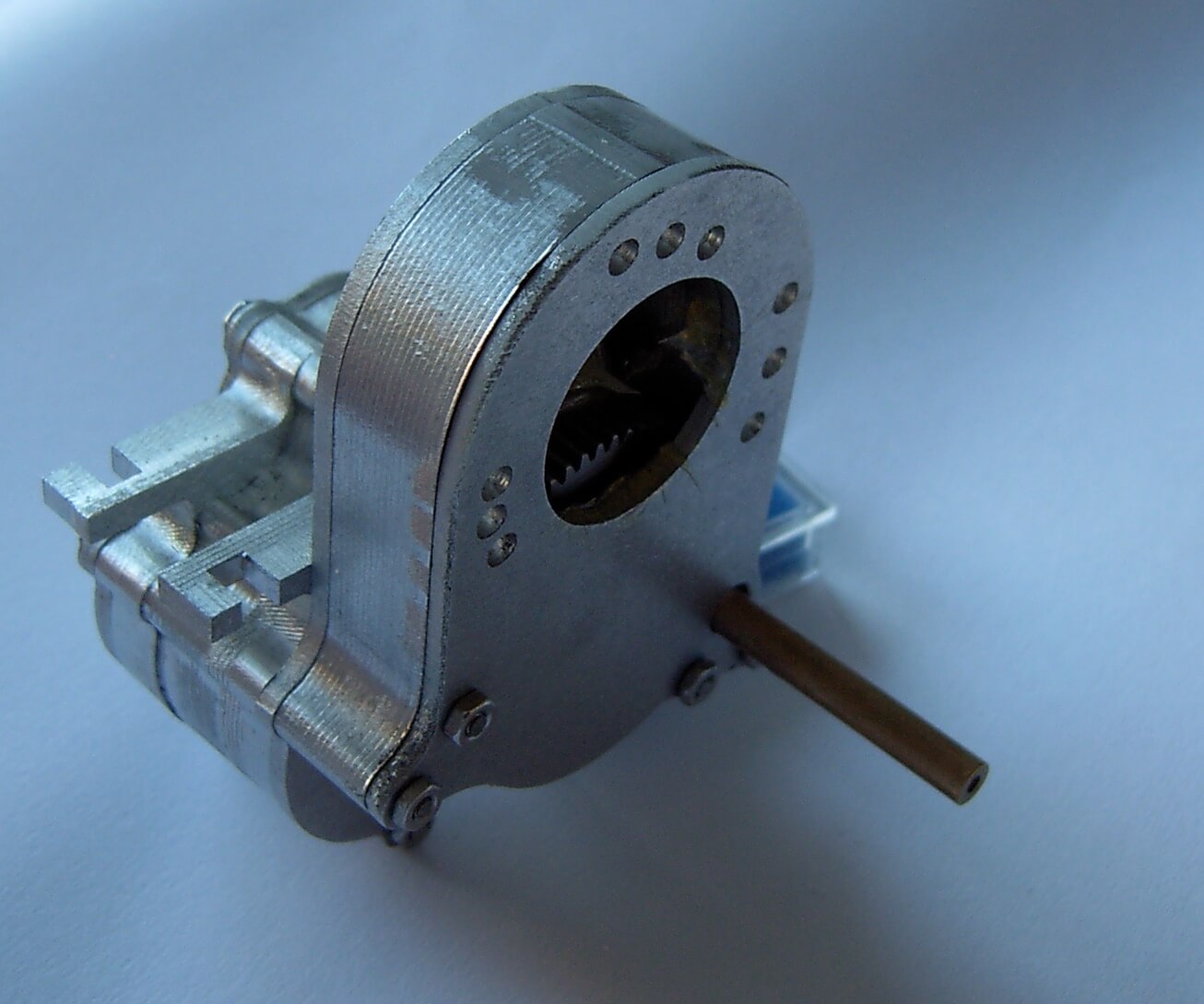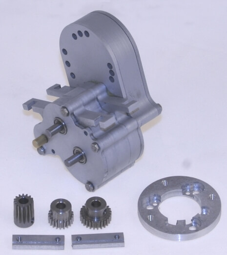 2-Gang Hauptgetriebe incl. 3 Motorritzel Gehäuse aus Alu, Zahnräder aus Stahl, alle Wellen kugelgelagert. Wellen 4mm. Verwendbare Motoren: Bühler(WDC), Faul- haber 3557C/CS.