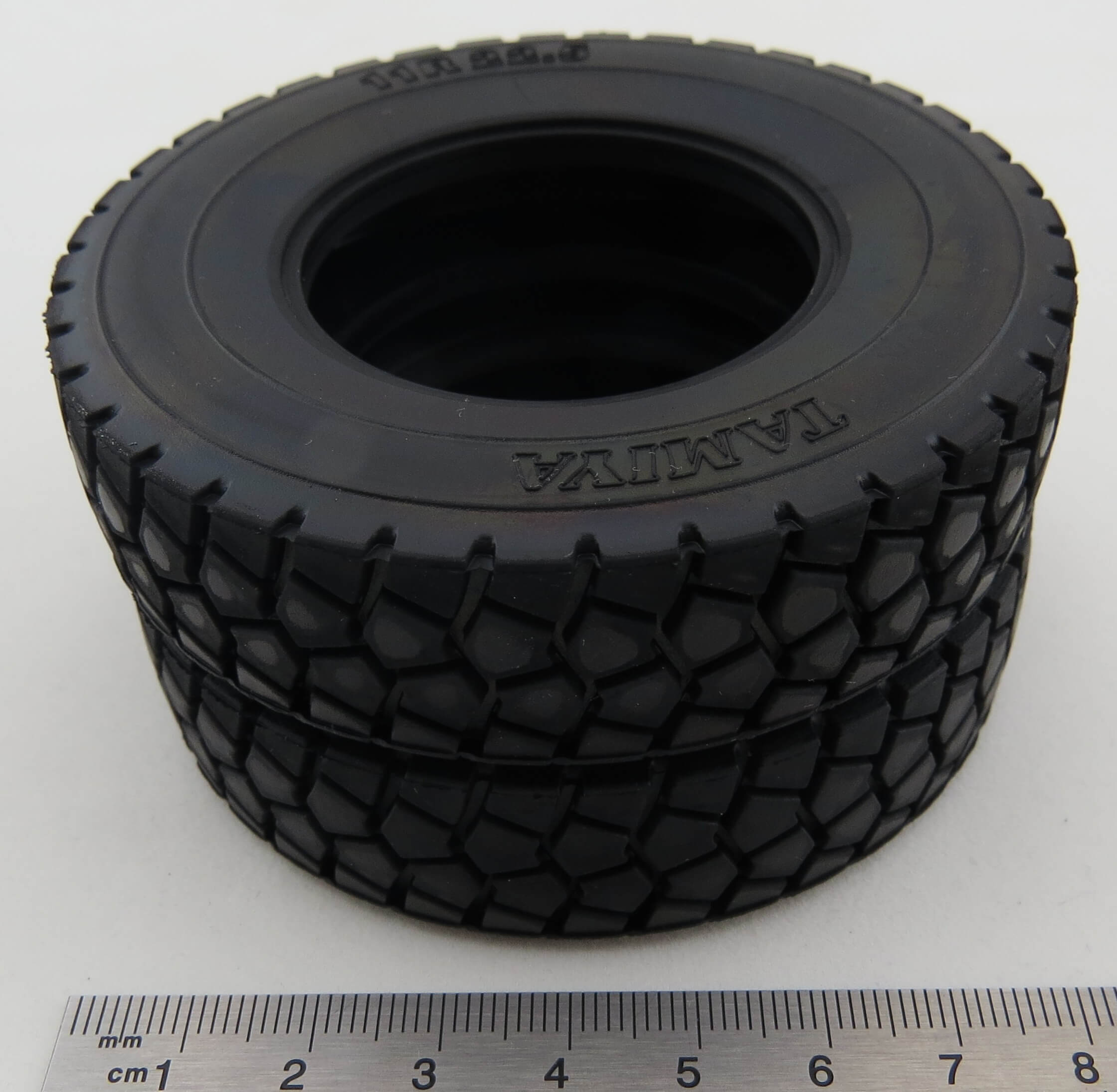 2 Geländereifen 11R22.5 Tamiya. Hohl- reifen. Außen:84mm. Innen:43mm. Breite: 22mm. Passend zu allen Standard- Felgen im Tamiya-Maßstab.