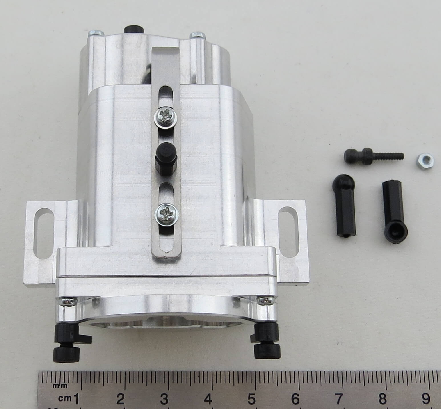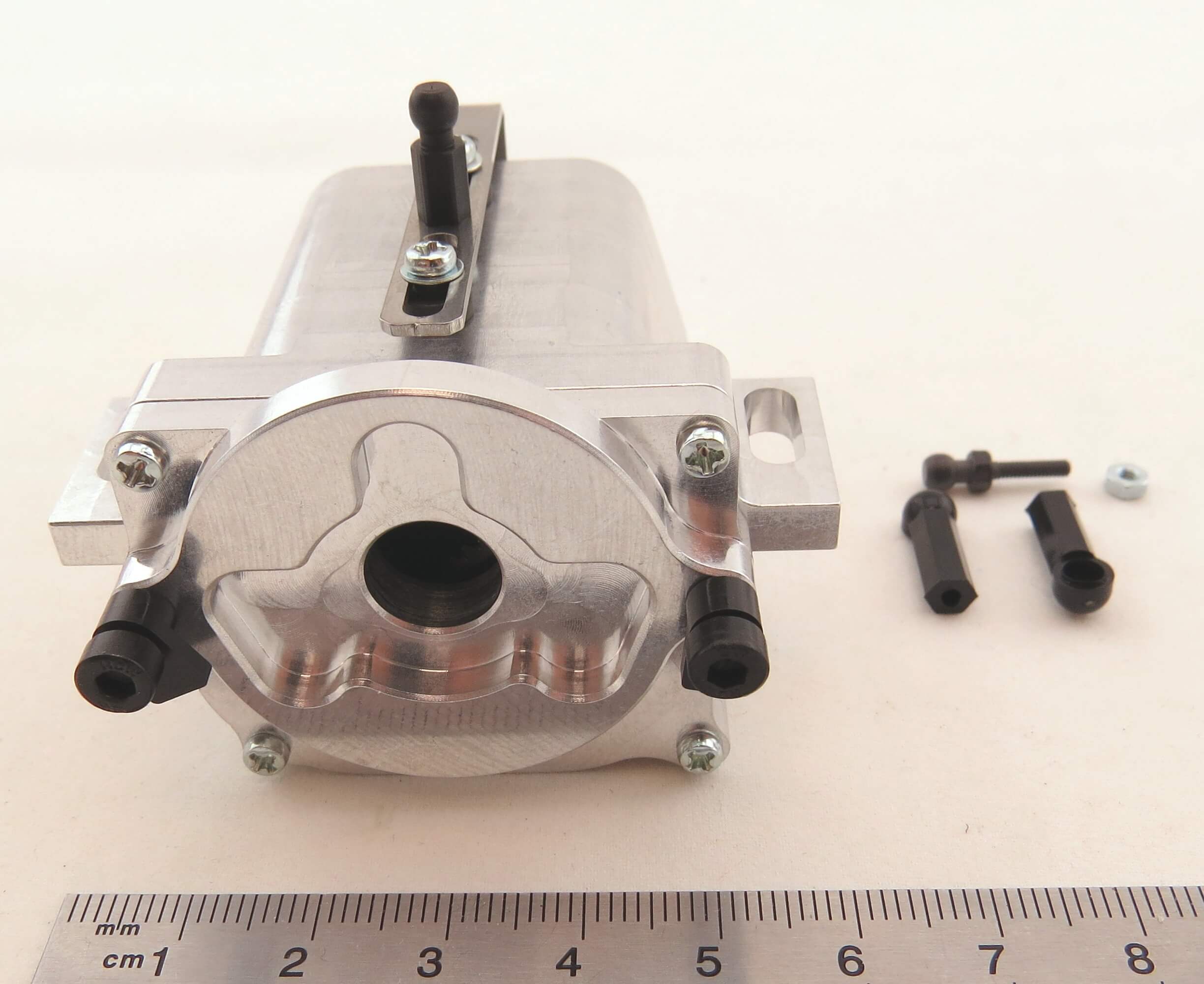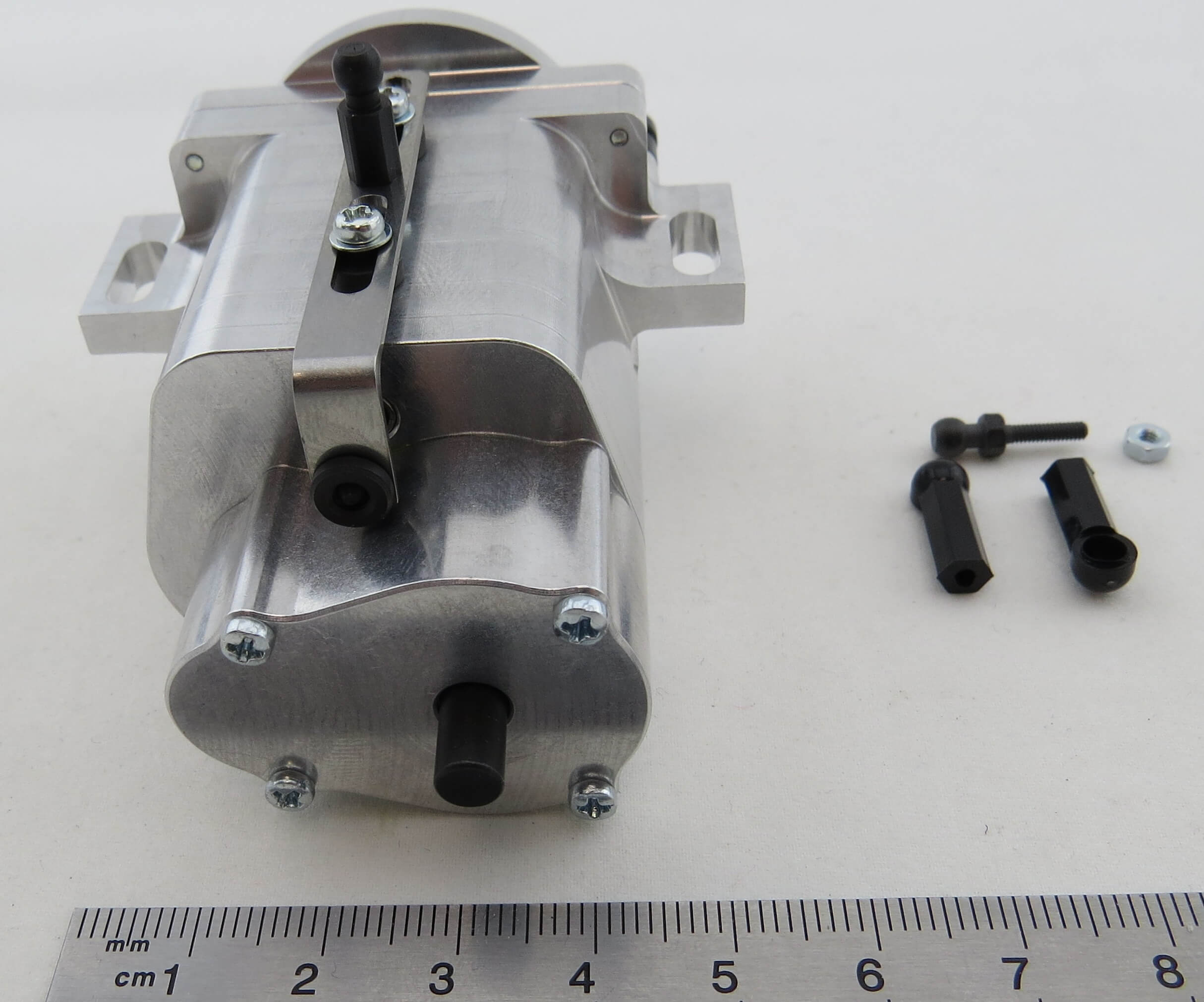 Das Getriebe ist montiert, der Motor und der dazu passende Flansch wird von außen über 2 Klemmen am Getriebe befestigt. Geschaltet wird über ein Servo. Die max. Eingangsdrehzahl beträgt 6.500 U/min.