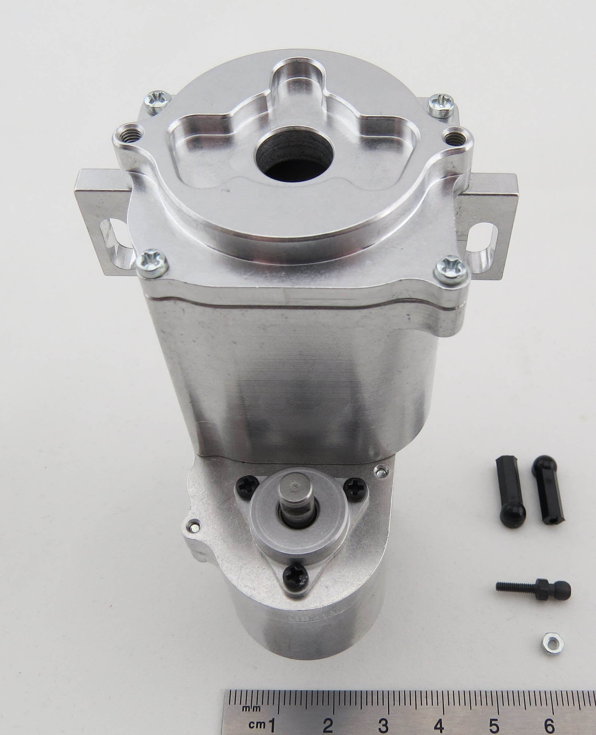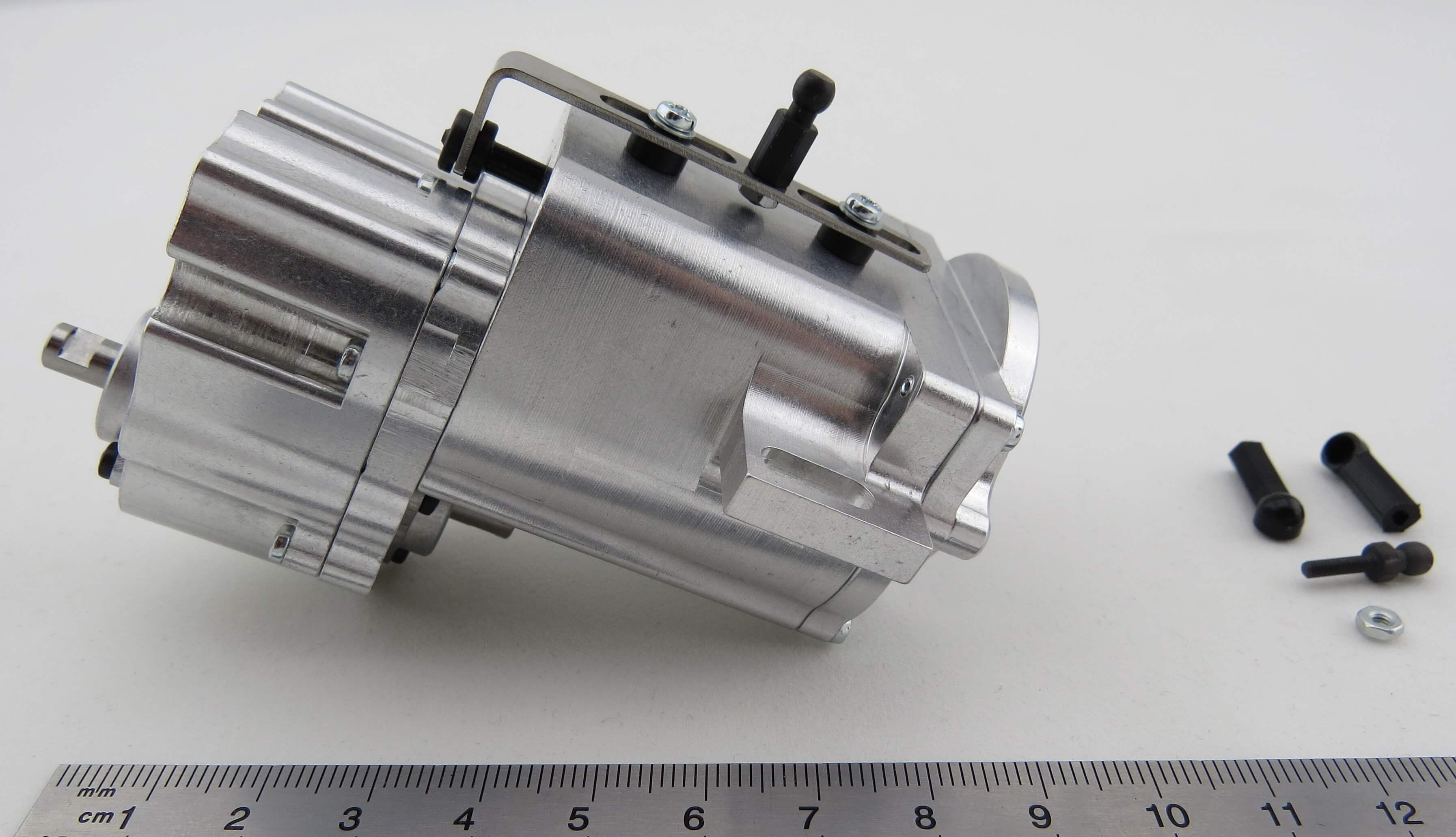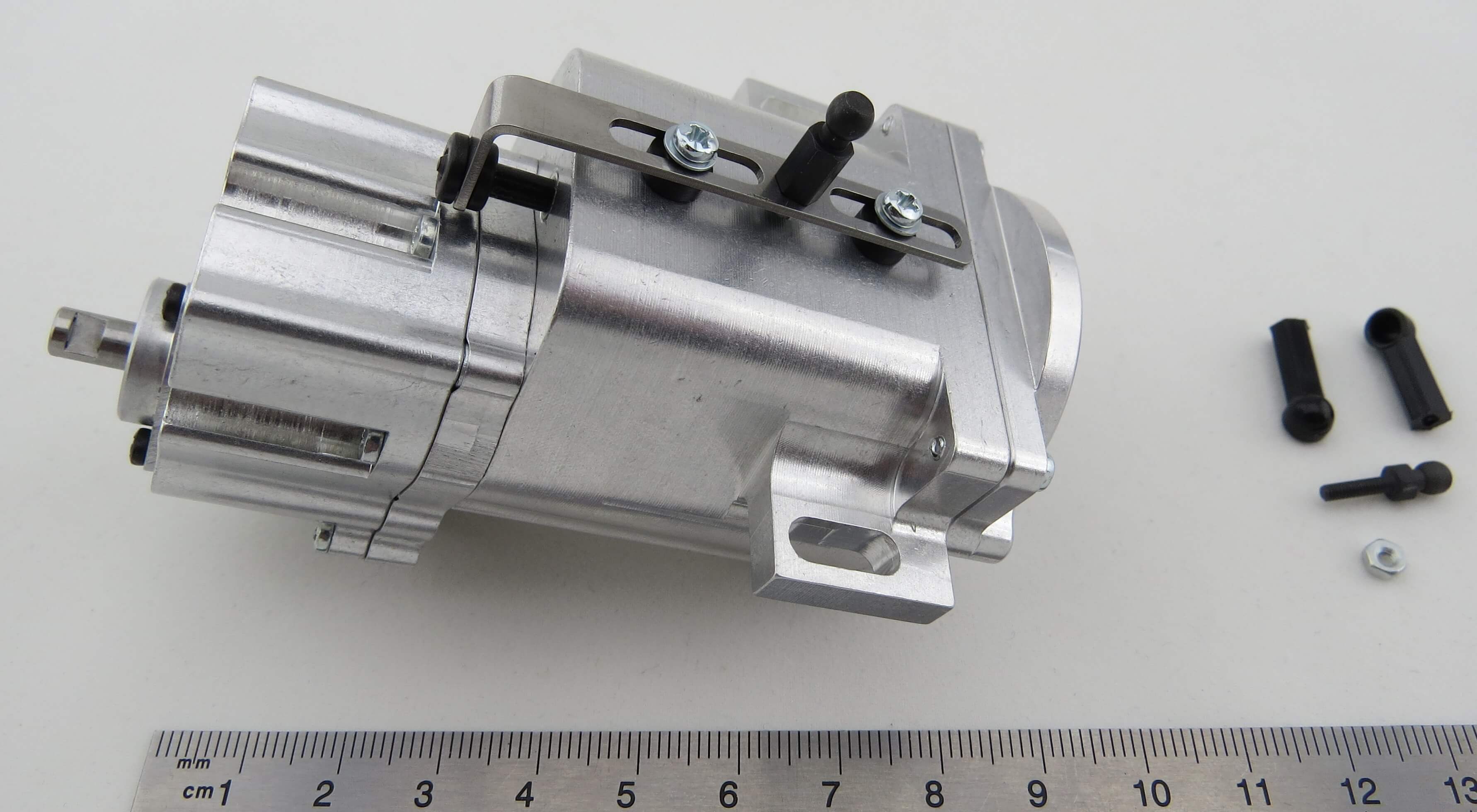 Das integrierte selbsperrende Differential gleicht Drehzahlunterschiede aus. Die Gänge werden über ein Servo geschaltet. Die maximal zulässige Eingangsdrehzahl beträgt 6.500 U/min.