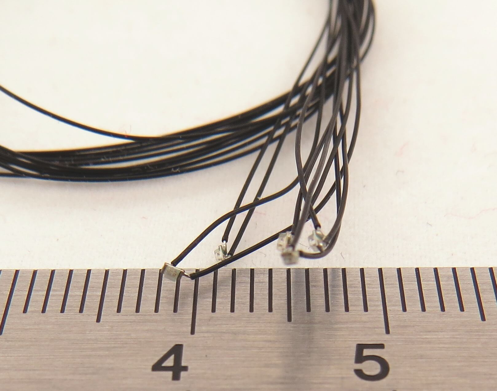 5x SMD-LED weiss (SMD-Bauform 0402) mit angelöteten Litzen. 1x0,5mm, 120° Ab- strahlwinkel, 300mcd, extrem kleine Bau- form. Mit Microlitzen. (5er-Packung). Litzenlänge ca. 220mm.