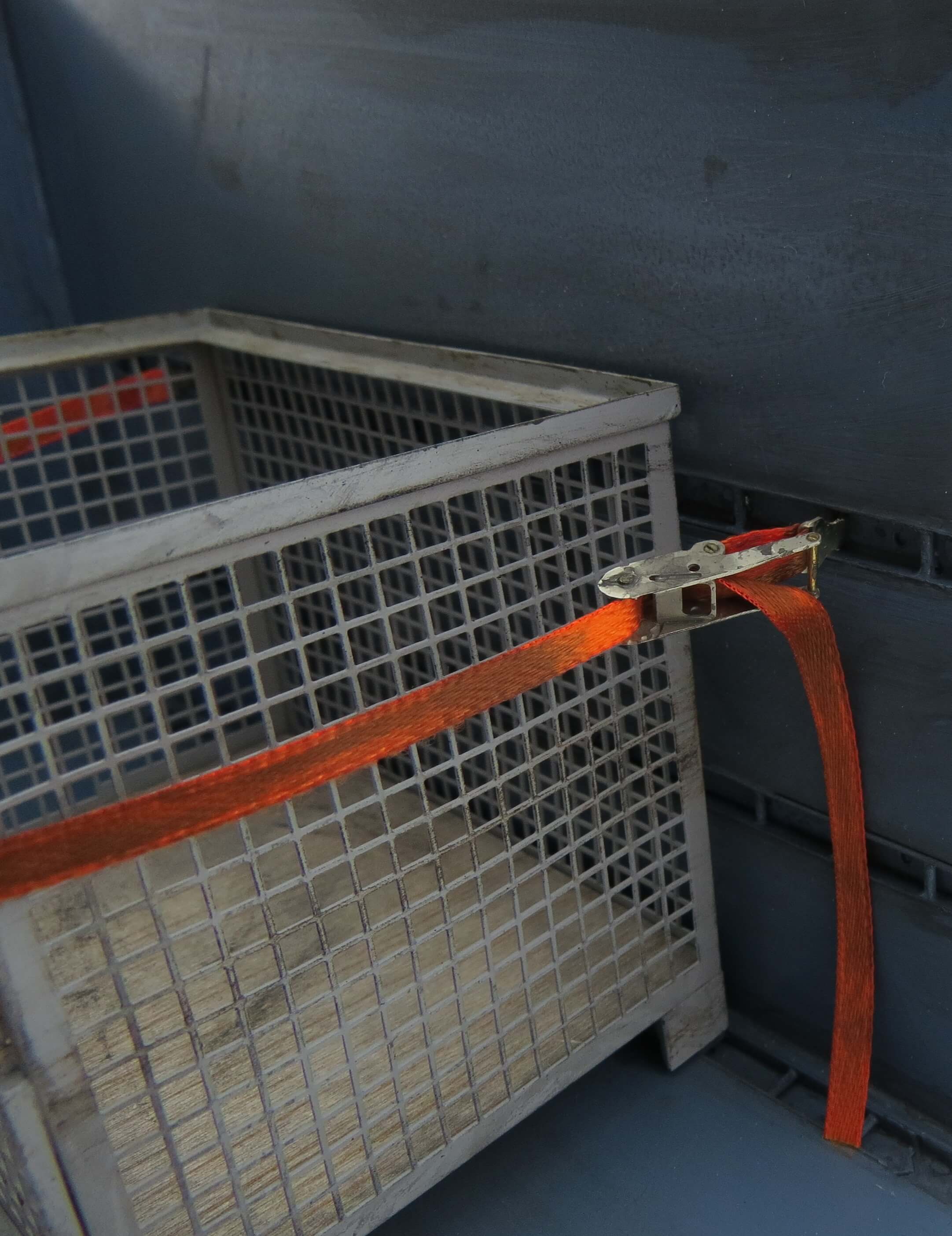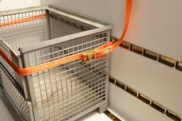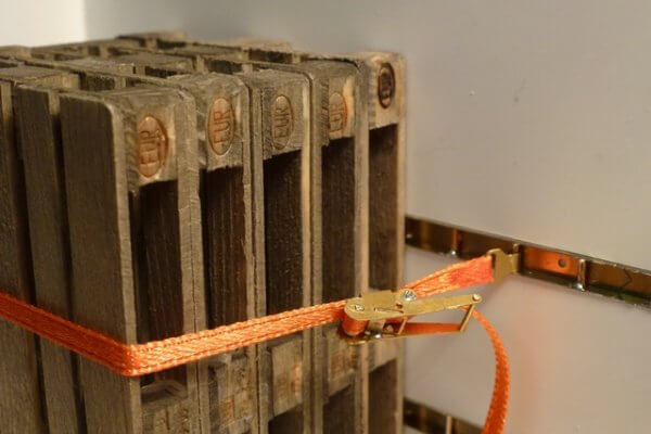 Sind die Lastschienen einmal im Modell verbaut, werden einfach die Haken der Schnellspanngurte entsprechend Ihrem gewünschten Ladegut eingehängt. Somit lassen sich ansprechende Verzurrungen von unterschiedlichsten Ladegütern auf dem Modell vorbilgetreu erreichen.