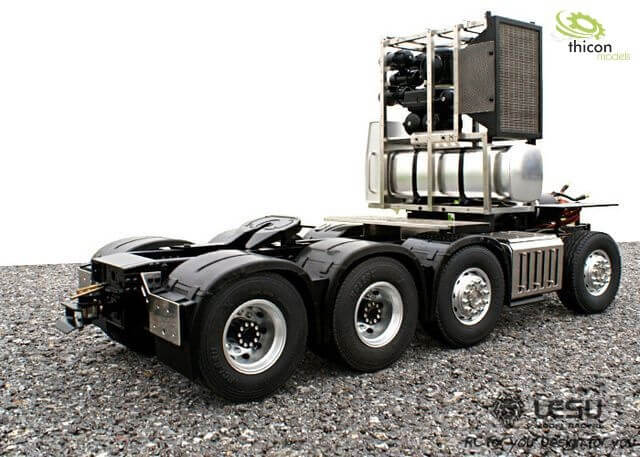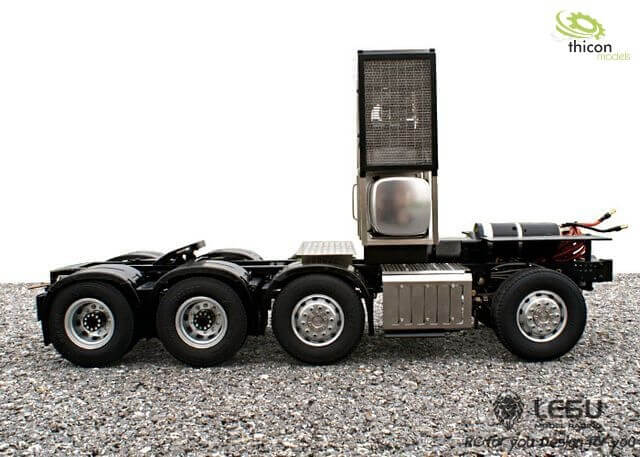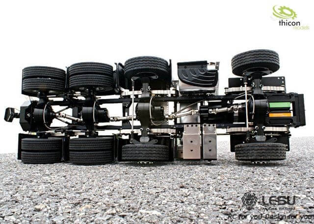 Fertig aufgebautes 8x8 Fahrgestell mit Schwerlastturm, Motor und Servos. Passend zum TAMIYA Actros- oder Arocs-Fahrerhaus.