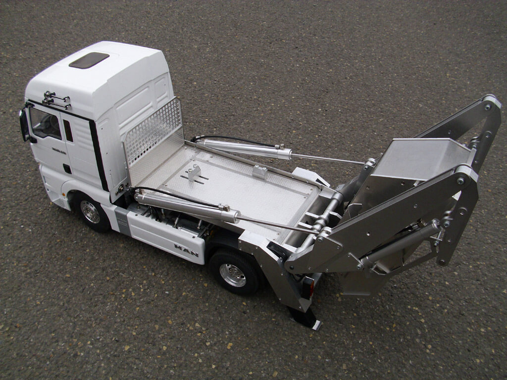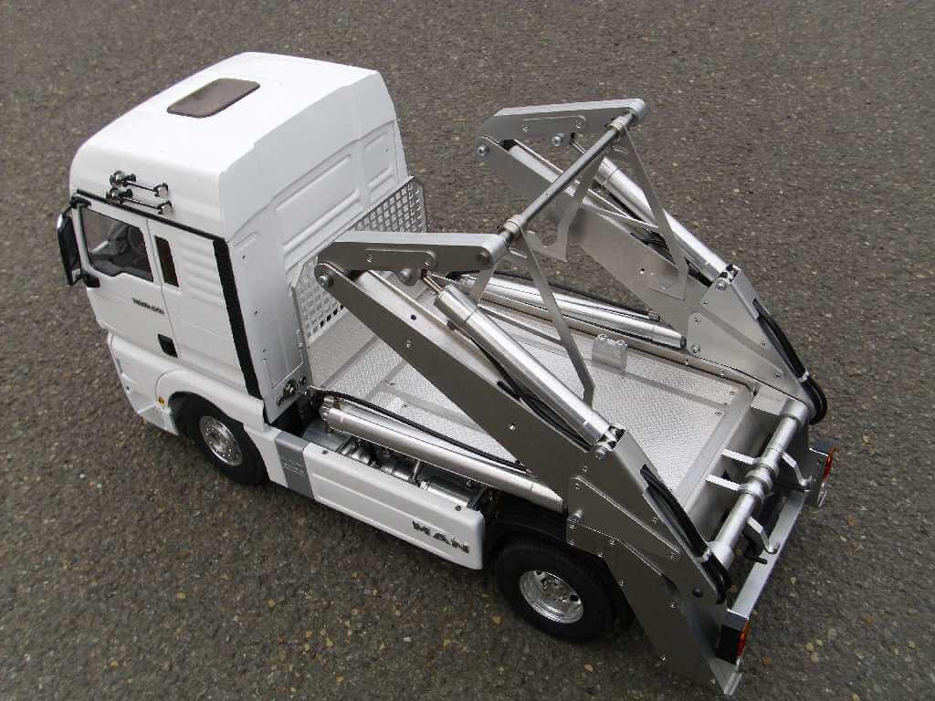 Mit diesem Bausatz bauen Sie ein Fahrzeug mit sehr hohem Spielwert. Komplettbausatz aus Alu inclusive Hydraulikpumpe, Zylinder, Ventile. Die Verriegelung zwischen Abkippen und Absetzen wird durch ein Servo gesteuert. Zwei Hydraulik-Zylinder heben die Mulde an.