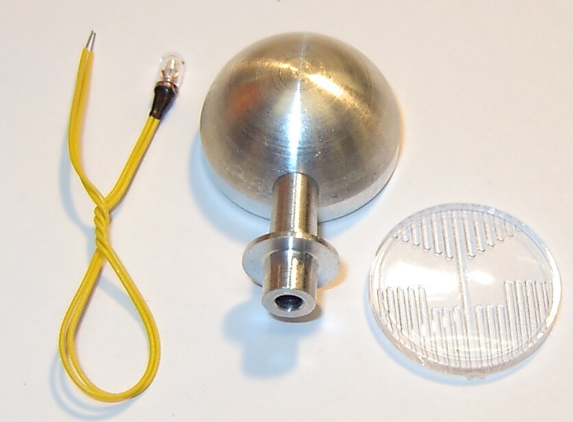 Alu-Lampe 24,5mm Durchmesser, mit Halter Alu, gedreht, mit Lichtscheibe und Birne für 6 Volt. Geamthöhe 40mm. (222515). Mit steckbarem Sockel.