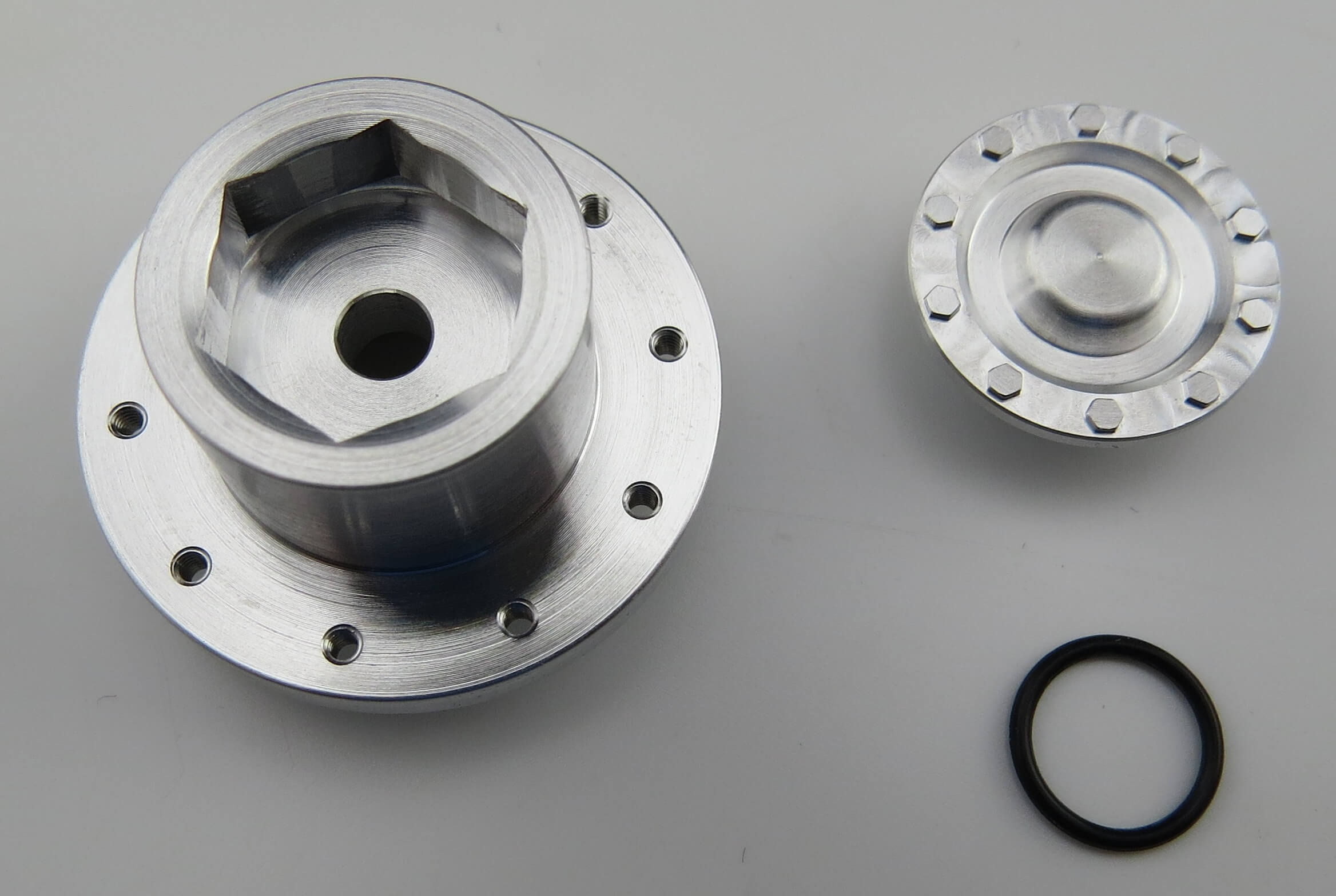 1x Alu-Nabe passend für angetriebene Lenkachsen mit Sechskant SW12. Für die Verwendung v. Felgen mit 25mm-Lochkreis! Mit 1 Nabendeckel (Alu) mit O-Ring- Befestigung.