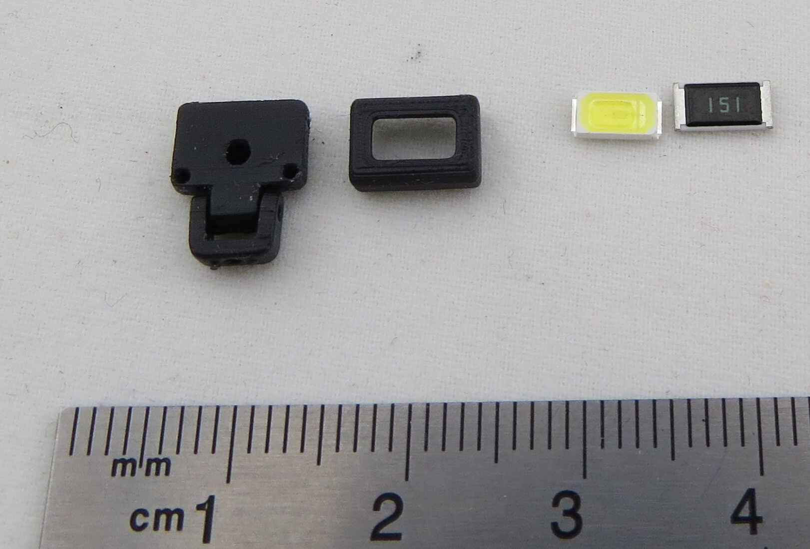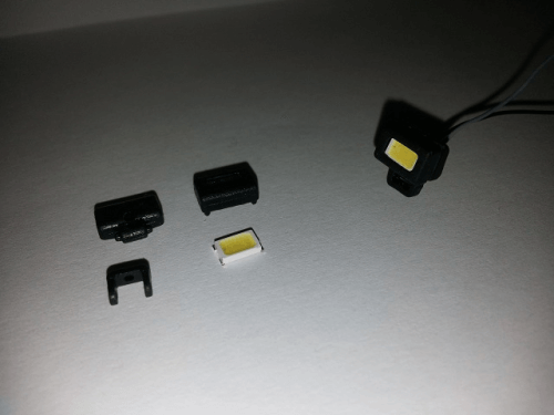 Arbeitsscheinwerfer Variante1 12V für Tamiya Modelle, 3-teilig, weiße LED und Vorwiederstand 3D-Druck, ABS schwarz Maße: 8x5,5(9,7)x5,5mm