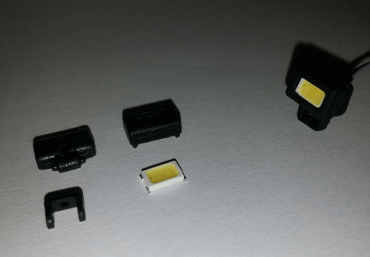 Arbeitsscheinwerfer Variante1 7,2V für Tamiya Modelle, 3-teilig, weiße LED und Vorwiderstand. 3D-Druck, ABS schwarz. Maße: 8x5,5(9,7)x5,5mm.