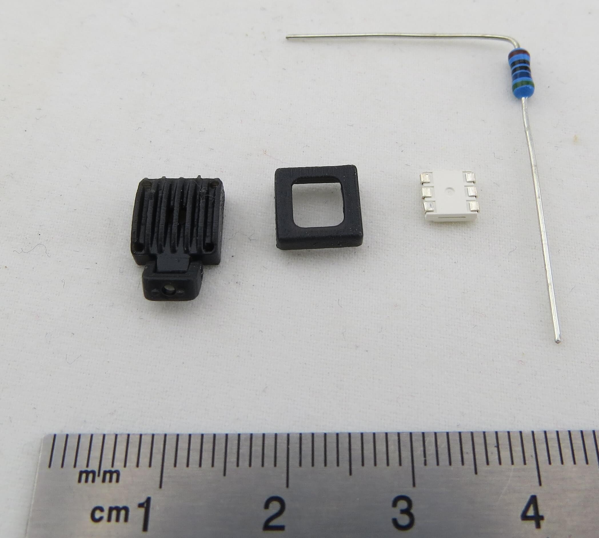 Arbeitsscheinwerfer Variante2 7-12V für Tamiya Modelle, 3-teilig, weiße LED und Vorwiderstand. 3D-Druck, ABS schwarz Maße: 8x8(12)x5,6mm.