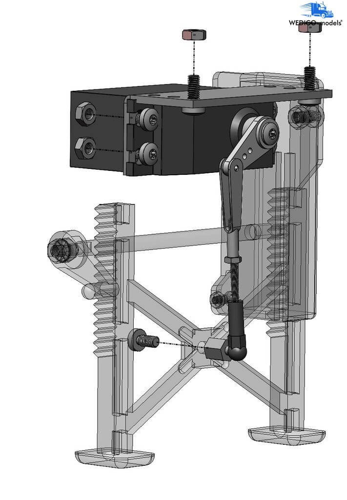 Auflieger-Doppelstütze. Für Auflieger. Wedico-Maßstab. Über Servo betätigbar oder mit Handkurbel. Mit Gelenkfuß. Aus Kunststoff, schwarz. Anlenkgestänge für Servo ist enthalten.