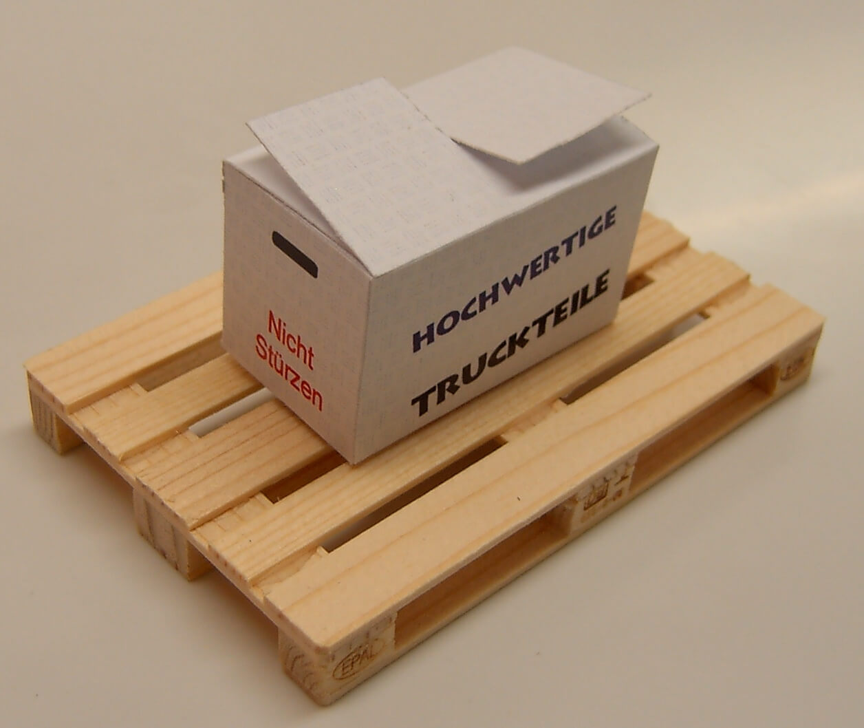 Ausschneide-Bogen (A4) mit 3 Karton- Kisten ca. je 43x24x27mm. Aufschrift: Hochwertige Truckteile. Zum Selbst-Ausschneiden!