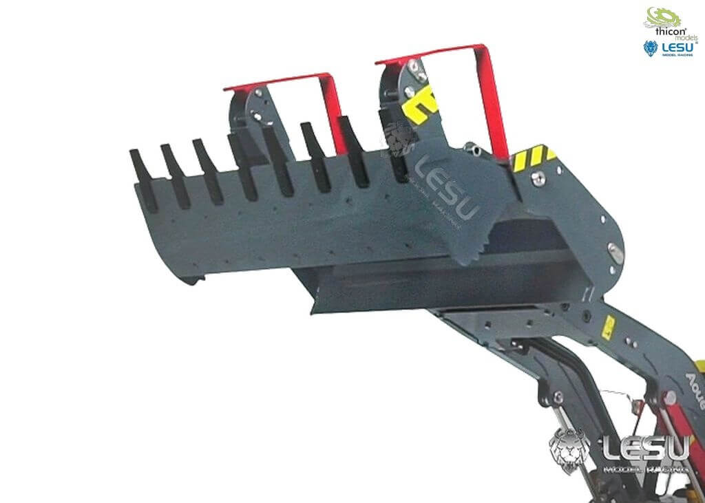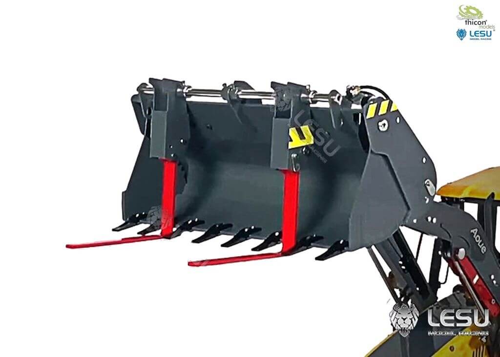 Der hydraulische Frontlader verfügt über eine Klappschaufel und eine umklappbaren Palettengabel.