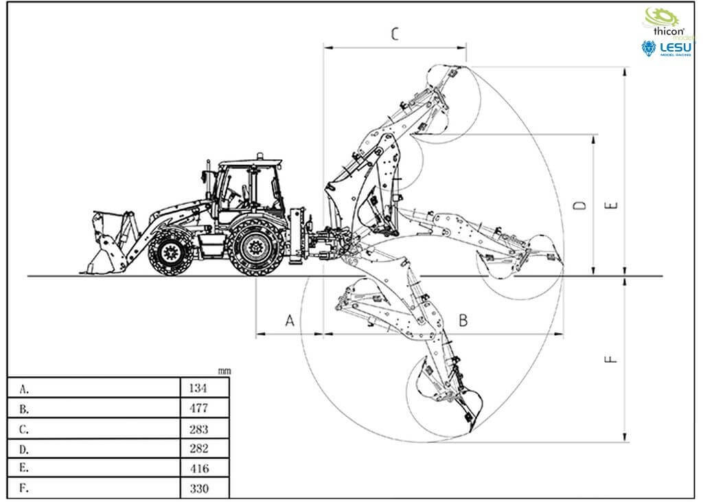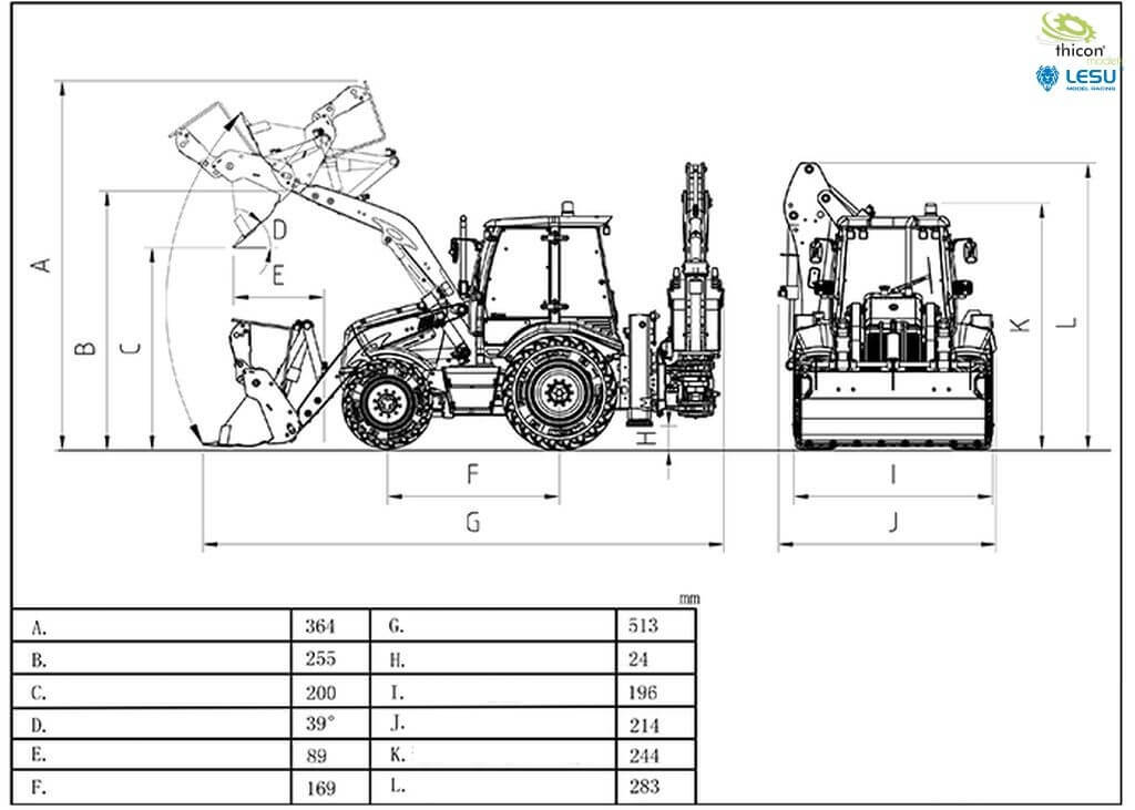 Länge: 513mm Breite: 196mm Höhe: 283mm Länge Bagger: 477mm Höhe Bagger: 416mm Höhe Schaufelunterkante: 255mm Gewicht: ca. 7600g