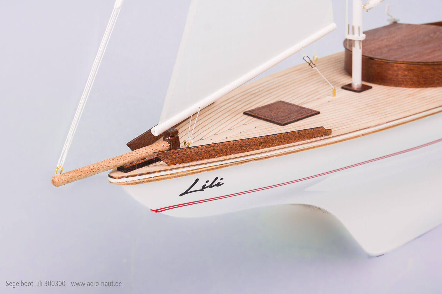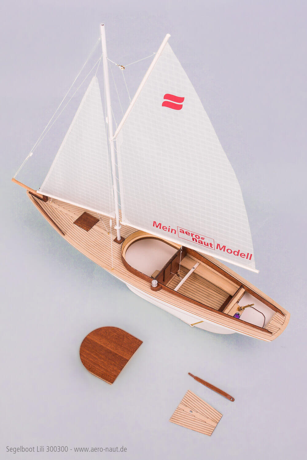 Das Segelboot Lili wird auf einem tiefgezogenen Kunststoffrumpf mit präzise geschnittenen Laserteilen aus Holz (Mahagoni, Birke) aufgebaut. Der Bausatz richtet sich auch an Einsteiger in die Segelboot-Szene. Durch die passgenauen Teile wird ein einfacher Aufbau ermöglicht. Die Plicht wird in einem Stück zusammengebaut und anschließend in den Rumpf eingesetzt und verklebt. Die Halterungen für den Mast sind im Deck bereits vorgegeben. Die Deckslinien wurden mit dem Laser graviert. Das Boot enthält viele Details und Beschlagteile wie Blöcke, Winschen, Umlenkrollen. Ein Bootsständer ist ebenfalls enthalten. Die Segel wurden bereits mit dem Laser passgenau geschnitten und können mit Hilfe eines Servos angesteuert werden. Der benötigte Ballast ist ebenfalls im Bausatz enthalten. Aufgrund der von aero-naut bekannten und einzigartigen Bauanleitung im 3D-Stil wird der Bau des Modells zu einem besonderen Erlebnis.