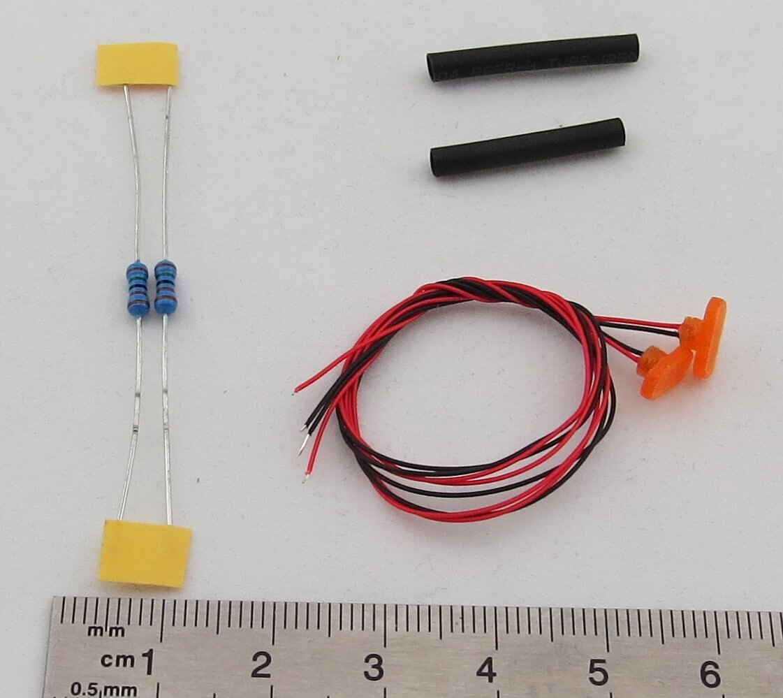 2x Begrenzungsleuchte orange, für den Maßstab 1/14 geeignet von 7,2-12 V. Aus Kunststoff mit eingeklebter SMD-LED. LxBxH: 8x4x1,2mm Bund: 3,2x2mm 500907382 200mm Kabellänge. Inkl. 2 Widerstände