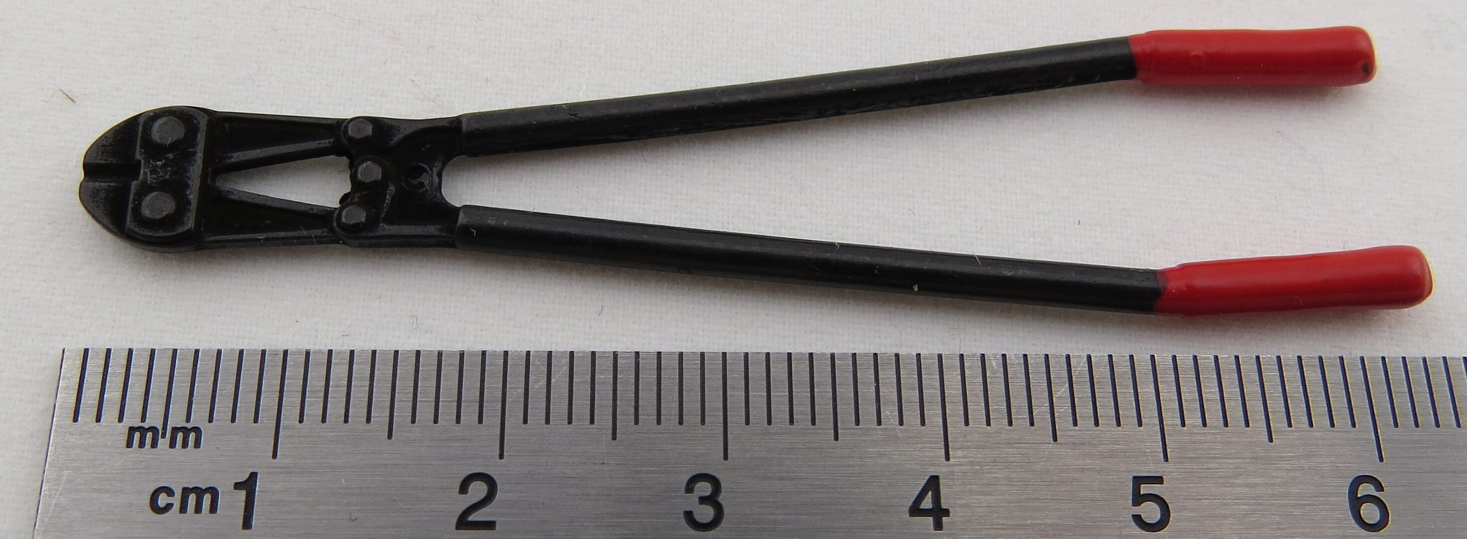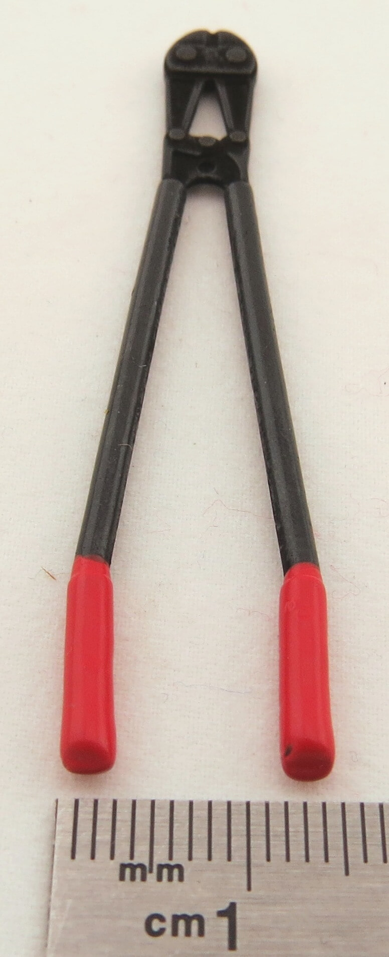 Bolzenschneider M 1:14 für den Einsatz bei Feuerwehr, THW, u.a. Diensten. Die Bolzenschneider sind aus Messing Feinguss gegossen worden und lackiert. Die Stiel-Enden (Griffstücke) sind in Gummi getaucht (rot).