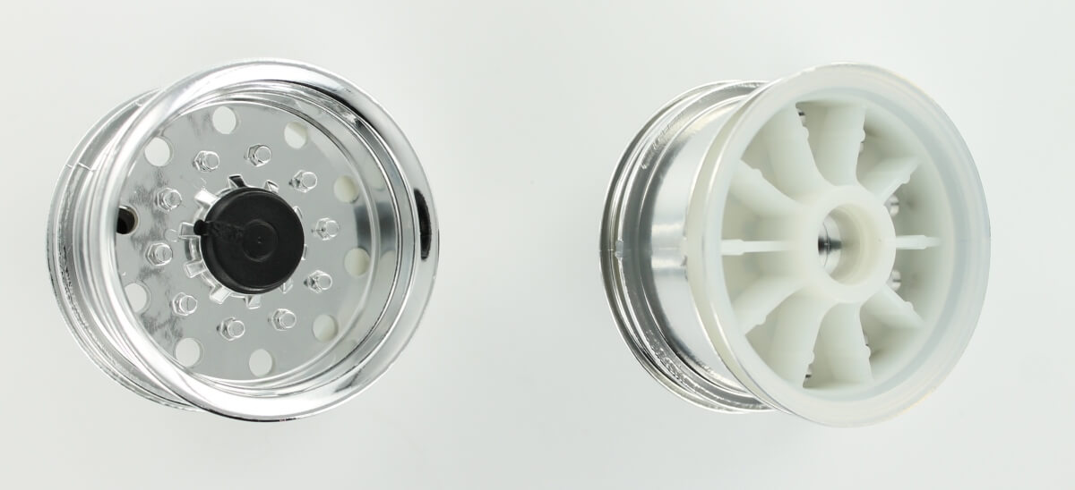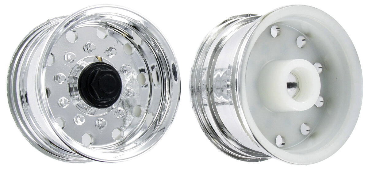 Aufliegerfelgen (2), Kunststoff, verchro für Tamiya, mit Kugellagersitz. Breite 28mm. Durchmesser 49/43mm. Breitfelge. (500907055).