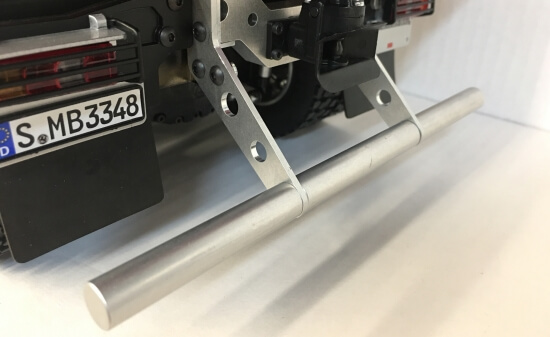 CARSON Alu Traverse/ Unterfahrschutz für Tamiya Arocs 3348. Die Hecktraverse und der Unterfahrschutz wurden für die Verwendung der Höherlegung optimiert um das Kupplungsniveau zu erhalten.