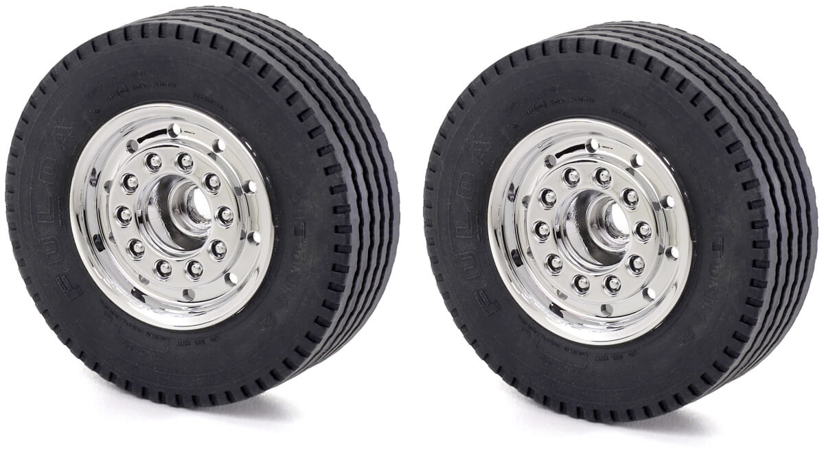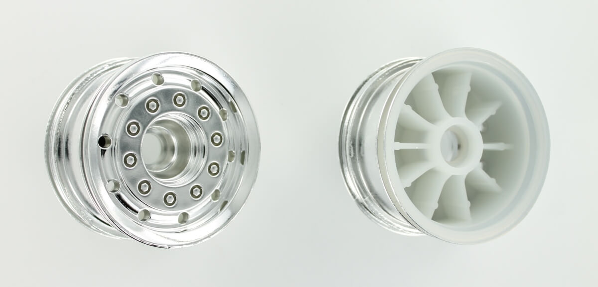Vorderachsfelgen (2), Kunststoff verchro für Tamiya 43,5mm Durchmesser,Horn 48mm 27mm breit. (500907061).