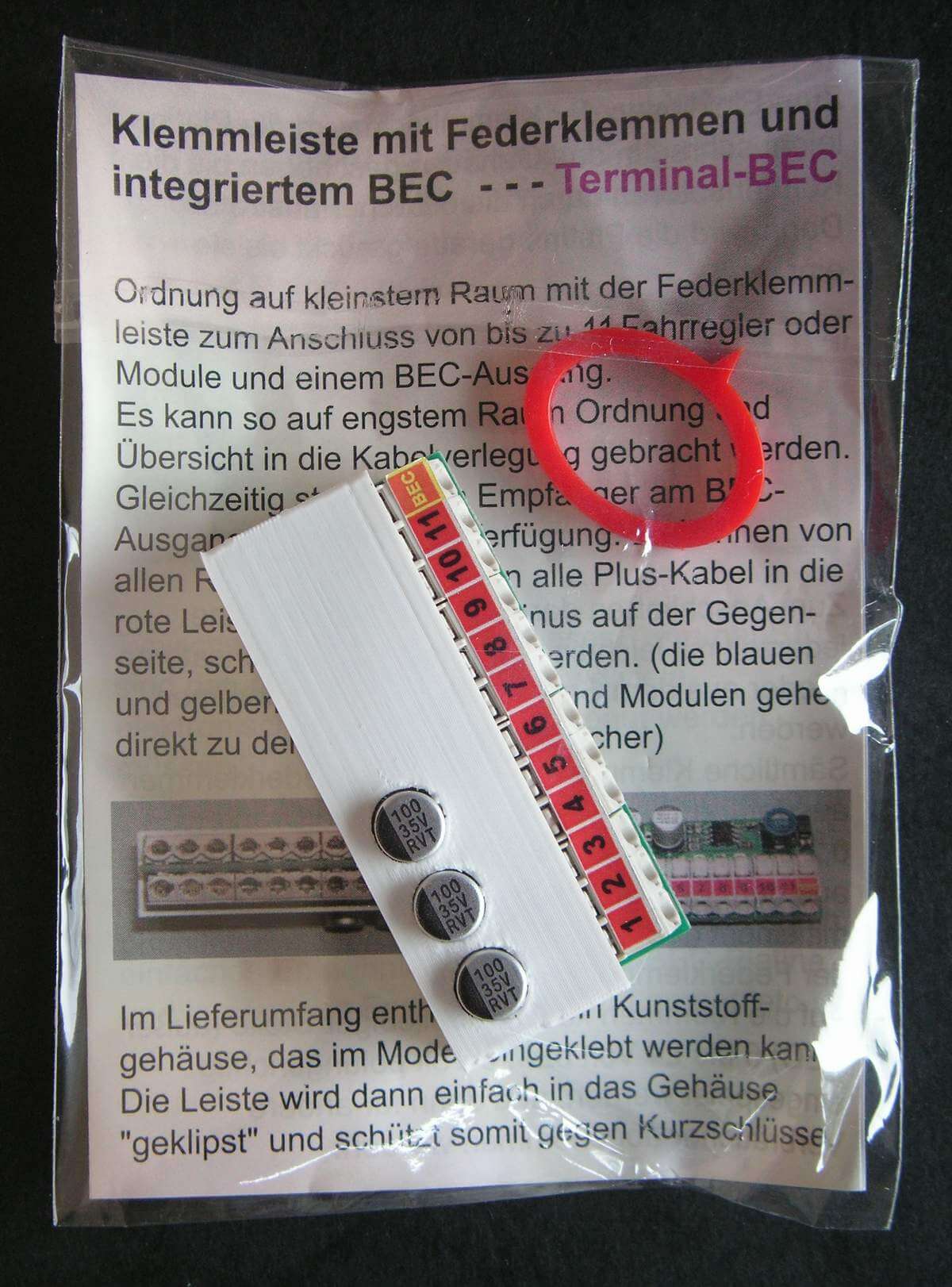 Klemmleiste mit Federklemmen und integriertem BEC - Terminal BEC. Mit diesem Modul kann auf kleinstem Raum Ordnung in die Kabelverlegung gebracht werden.