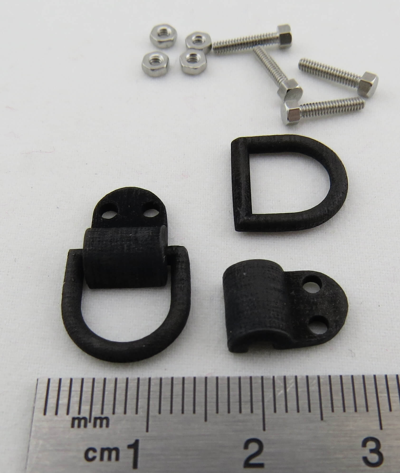 1 Paar D-Ringe mit Befestigungsmaterial, Messing-Feinguss. 1-seitige Lasche. Als Zurr- oder Schleppöse verwendbar. Messing, GESCHWÄRZT. Passend zu M1:16 - 1:14.