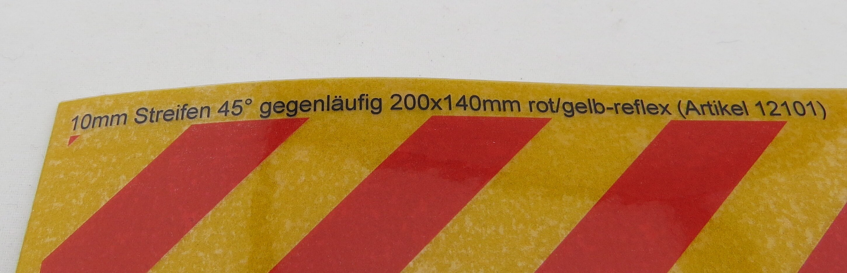 Dekorbogen Warnstreifen REFLEKTIEREND ca. 200x140mm 10mm-Streifen, rot/verkehrsgelb-reflektierend, selbstklebens, 45° rechts/links- gegenläufig.