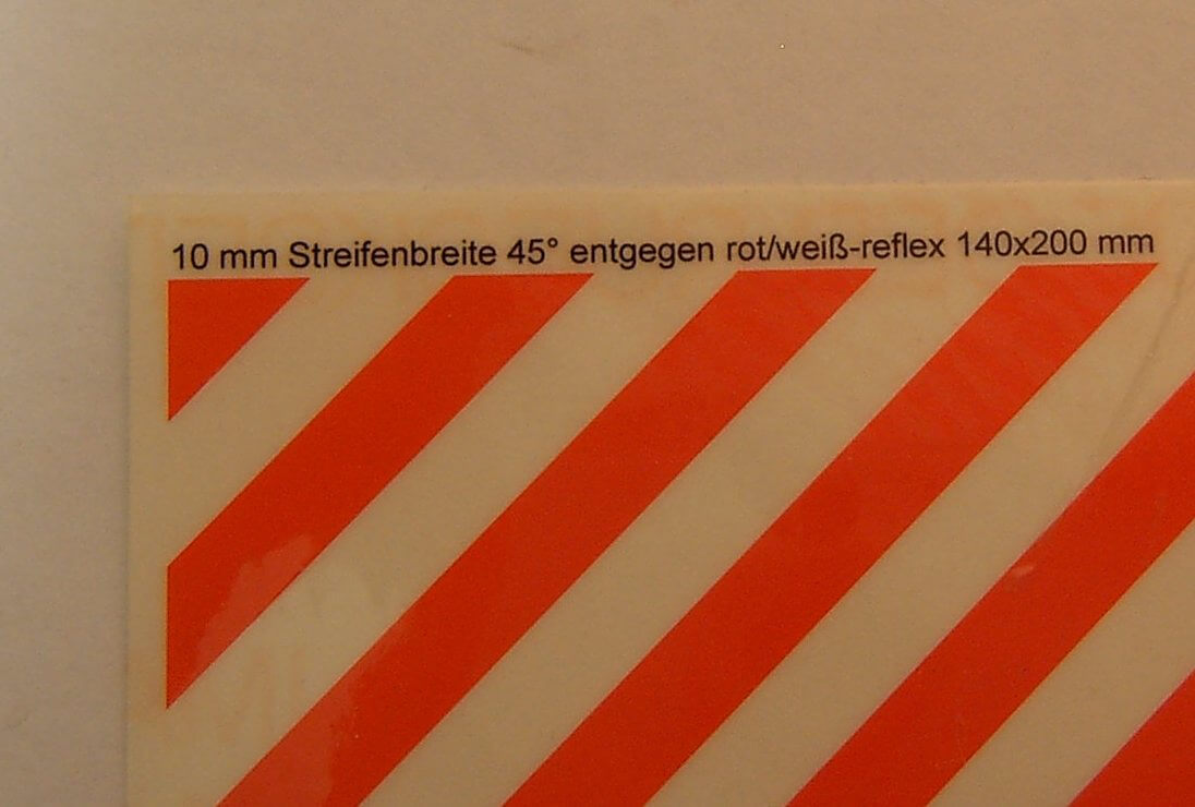 Dekorbogen Warnstreifen REFLEKTIEREND ca. 200x140mm 10mm-Streifen, rot/weiß-reflektierend, selbstklebend 45° rechts/links-gegenläufig.