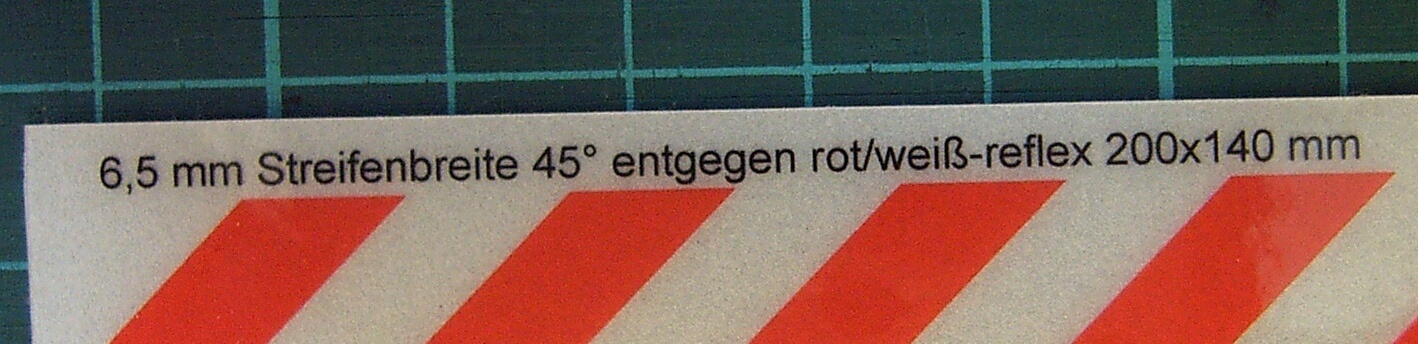 Dekorbogen Warnstreifen REFLEKTIEREND ca. 200x140mm 6,5mm-Streifen, rot/weiß-reflektierend, selbstklebend 45° rechts/links-gegenläufig