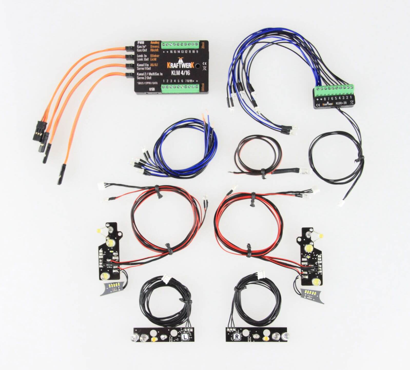 Dieses Starterset umfasst eine komplette Lichtanlage für den Mercedes-Benz Actros 3363 von TAMIYA und besteht aus zwei vorderen Beleuchtungsplatinen mit verdrahteten LEDs für die seitlichen Blinker, Unterfahrschutz- und Begrenzungsleuchten, sowie einem Lichtassistent KLM 4/16.br>Die Beleuchtungsplatinen werden direkt an den KLM 4/16 angeschlossen und können über diesen auch mit unserem Kraftwerk ControlPanel konfiguriert werden. Helligkeiten, Blinkgeschwindigkeiten, aber auch die grundsätzliche Funktionalität (z.B.: soll auf dem Ausgang das Fernlicht geschaltet werden) kann für jeden Ausgang separat eingestellt werden. Informationen hiezu finden Sie