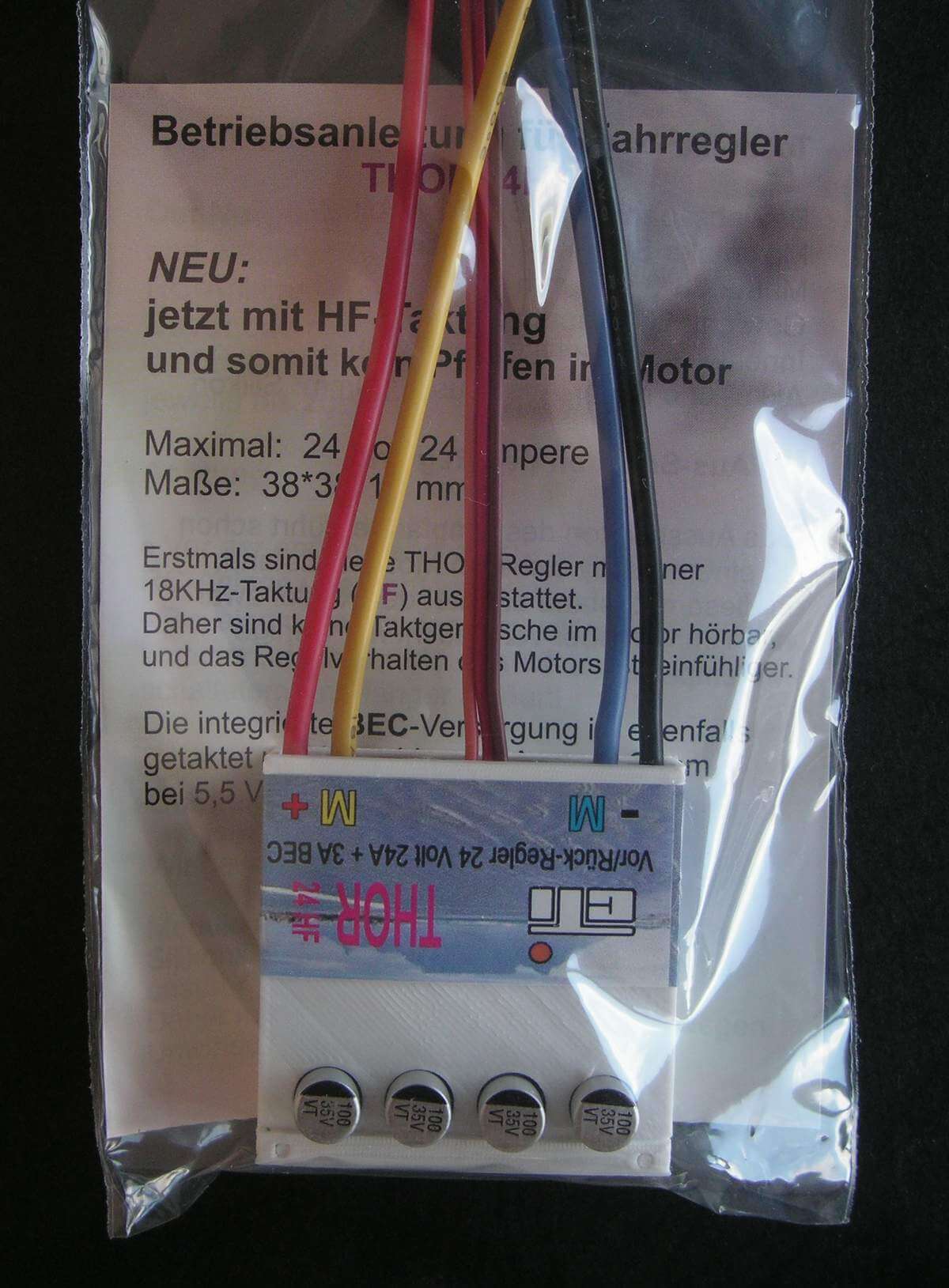 Fahrregler THOR 24-HF 6 bis 24V max. 24A. 100% vorwärts, 100% rückwärts. Mit BEC 3000mA. Für Ansteuerung von 1 Motor. 38x38x15mm, 30 gr., CTI- Produkt. 18kHz-Taktung (HF).