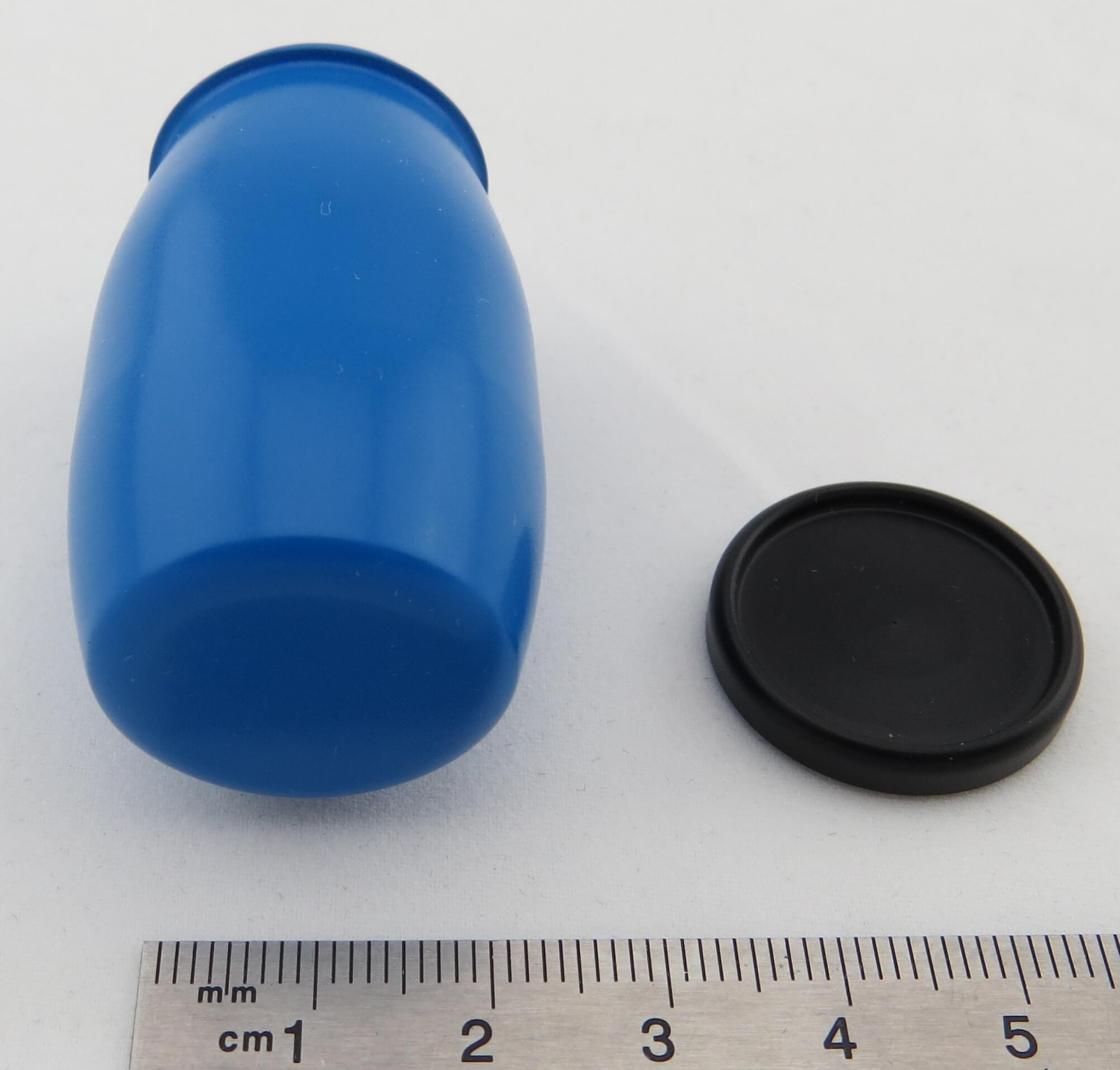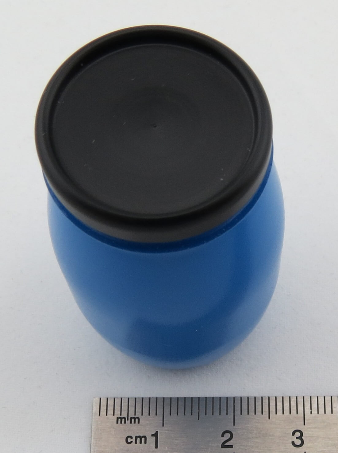 1x Fass, wie Kunststoff-Fass 120L. Fass-Körper aus Alu (hohl), blau pulver- beschichtet. Mit schwarzem Kunststoff- Deckel. Gesamthöhe 50mm, Stand-Durch- messer 23mm, maximale Breite 29mm.