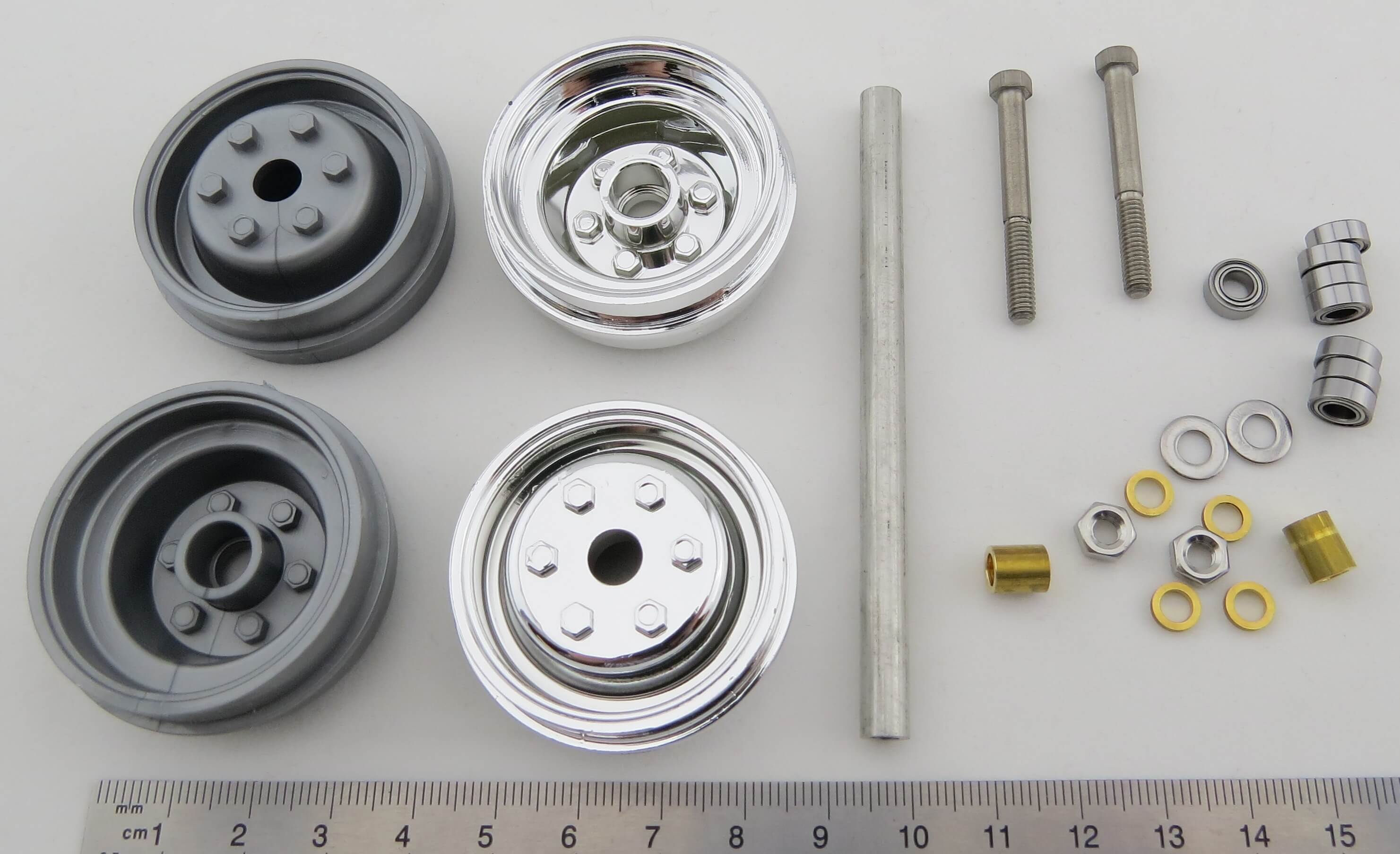 Felgen kugelgelagert, Stand. Hinterachse (Wedico 2013). 4 Kunststoff-Felgen (2x grau, 2x verchromt), 1 Starrachse, 8 Kugellager, Befestigungsmaterial, Anleitung.