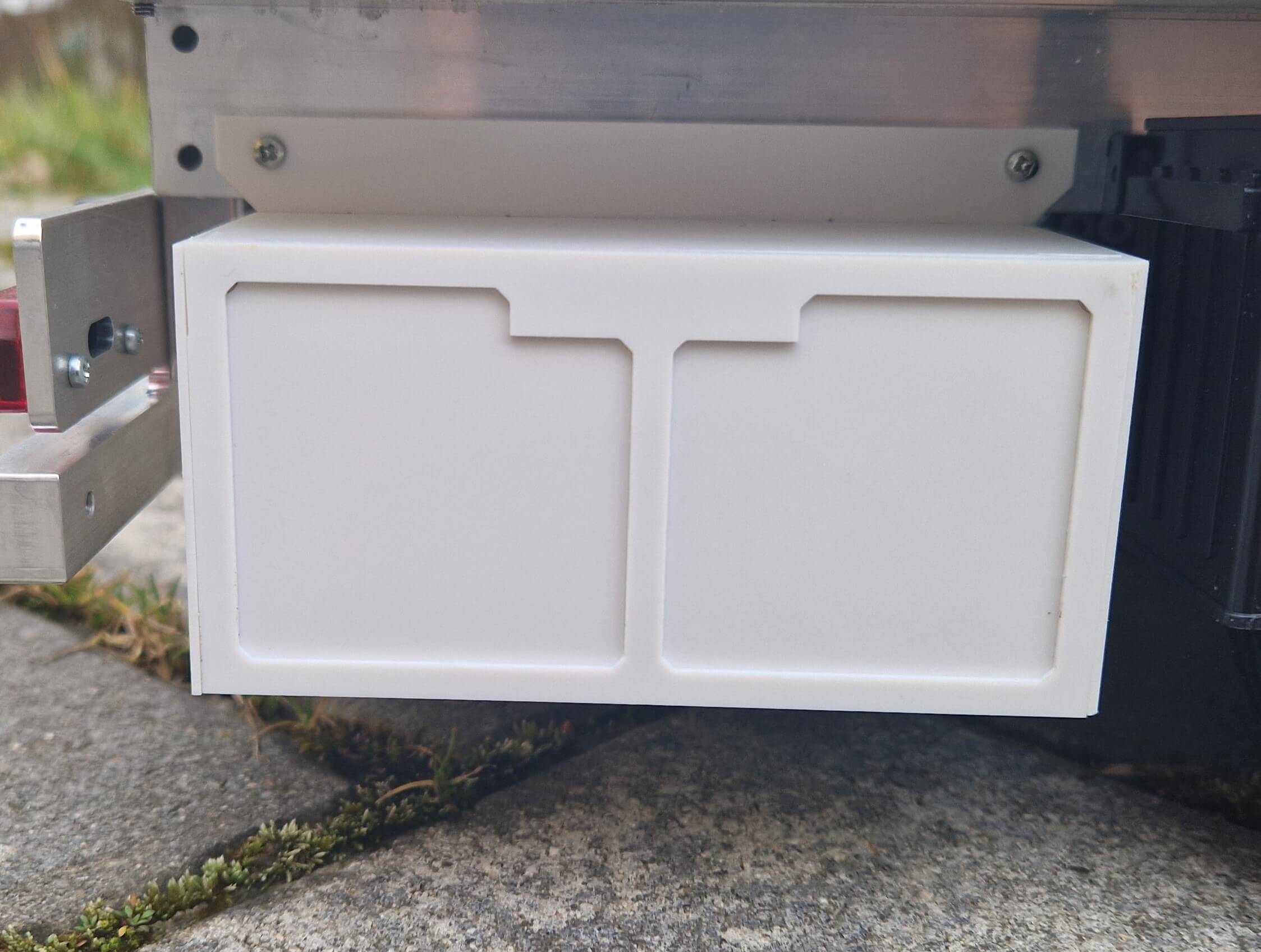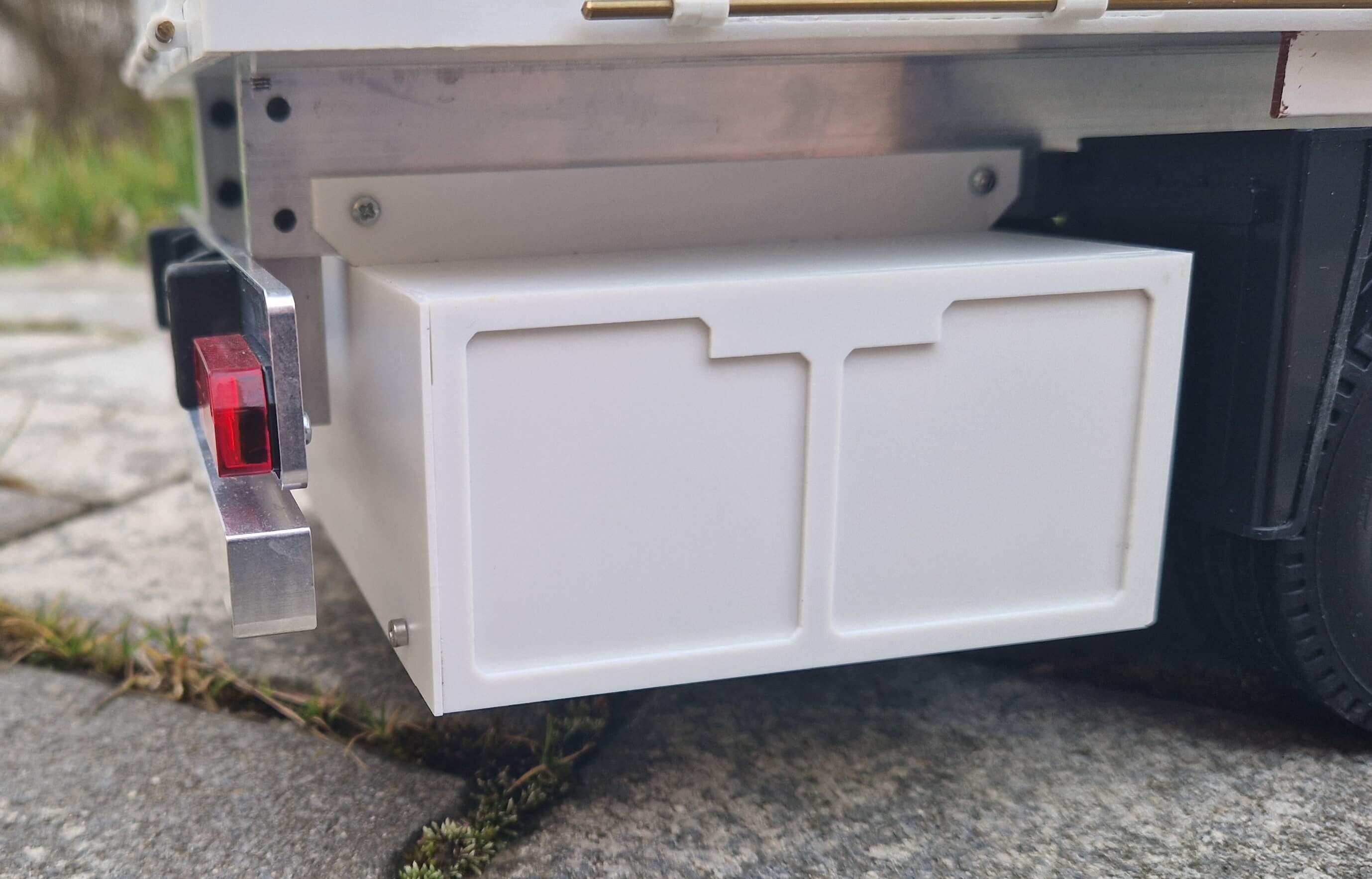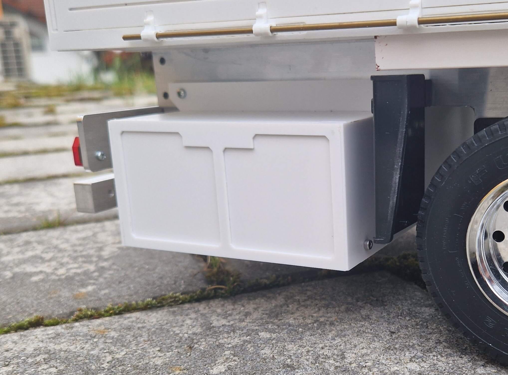 Bausatz aus weißem Polystyrol-Teilen. Der fertige Palettenkasten wird mit Hilfe der Halter von unten an den Fahrzeugrahmen geschraubt. Die Klappen lassen sich auf beiden Seiten öffnen und werden durch starke Miniaturmagnete im geschlossenen Zustand gehalten.