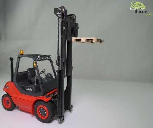 Gabelstapler Linde H40D rot, hydraulisch . Metall-Bausatz mit Hydraulik, Licht und Sound. M 1:14.Rot pulverbeschichtete Karosserie-Teile. Version 2.