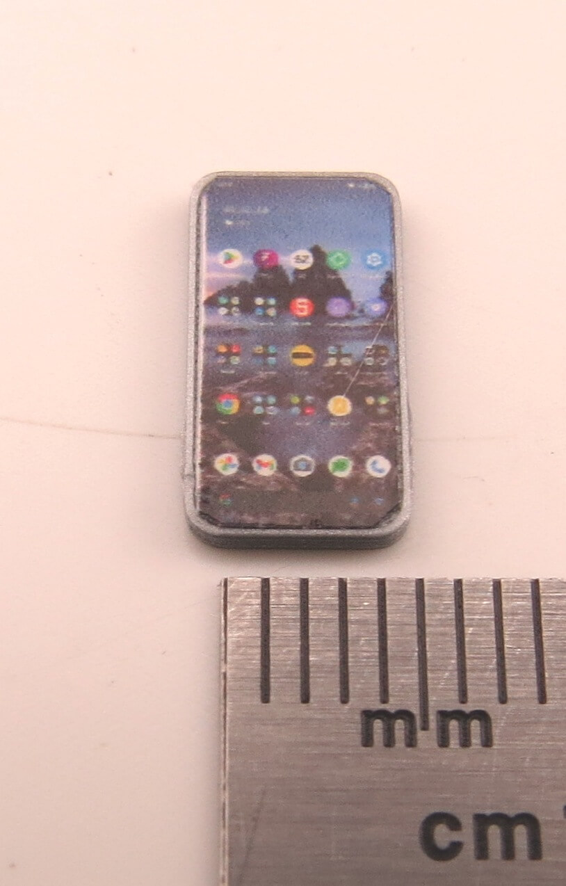 Handy (SmartPhone) ca. 12x6mm, Kunststoff, schwarz. Mit angedeuteten realitätsnahem Display. Zur Ausstattung von Fahrzeugen und Arbeitsplätzen.