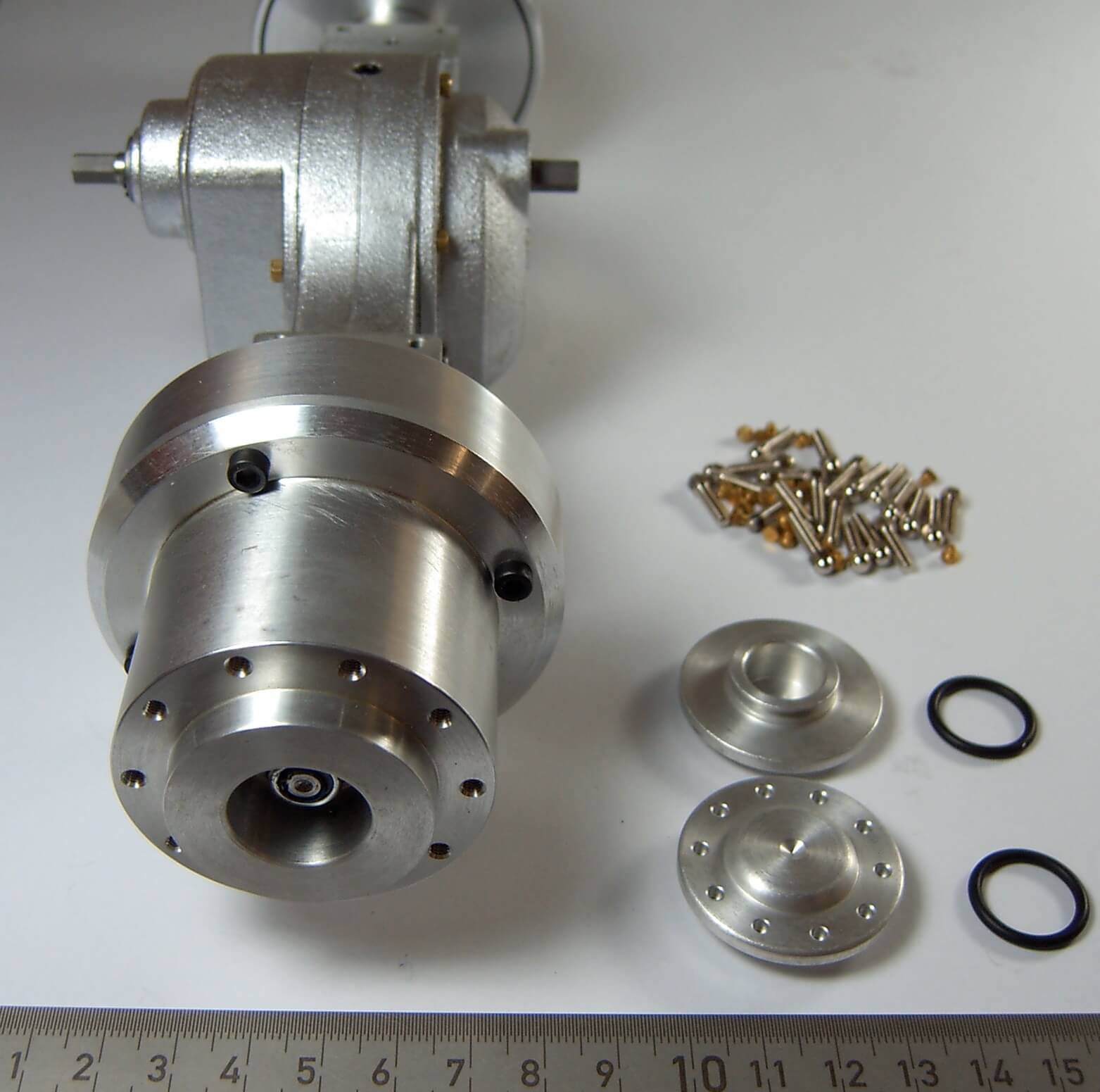 Hinterachse mit Planetengetriebe 1:8 komplett kugelgelagert, mit Durchtrieb mit Nabendeckel u. Schrauben/Kleinteile. Für EINZEL-Bereifung. (218332).