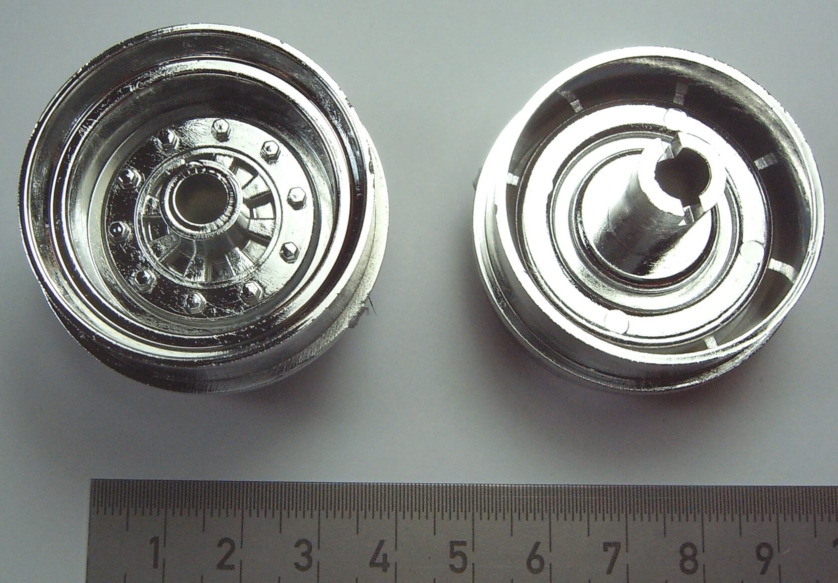 Hinterachsfelgen, verchromt für Breit- reifen (454). 2 Stück. Außendurchmesser 39mm, Breite 22mm, für Achse 6mm.