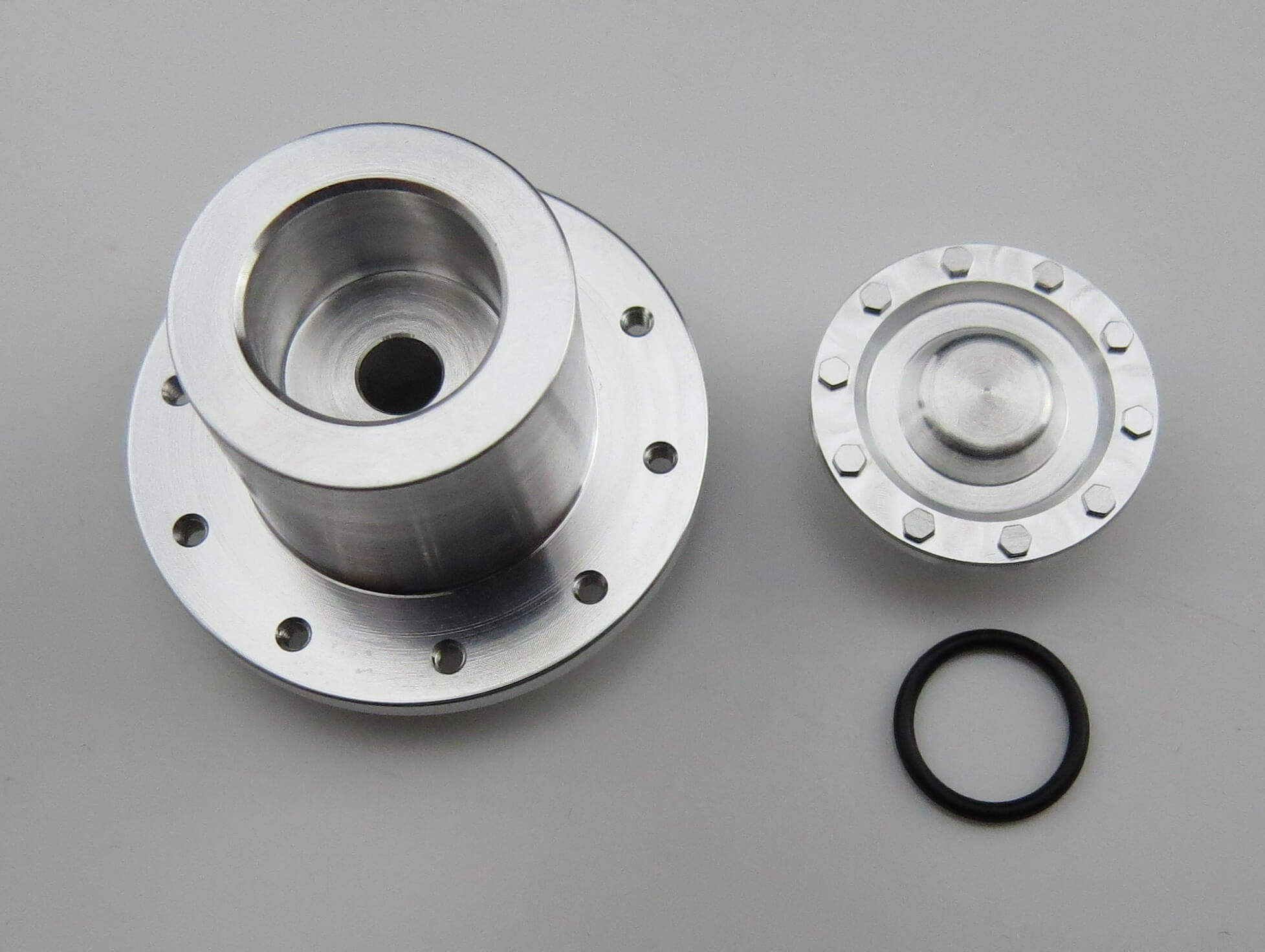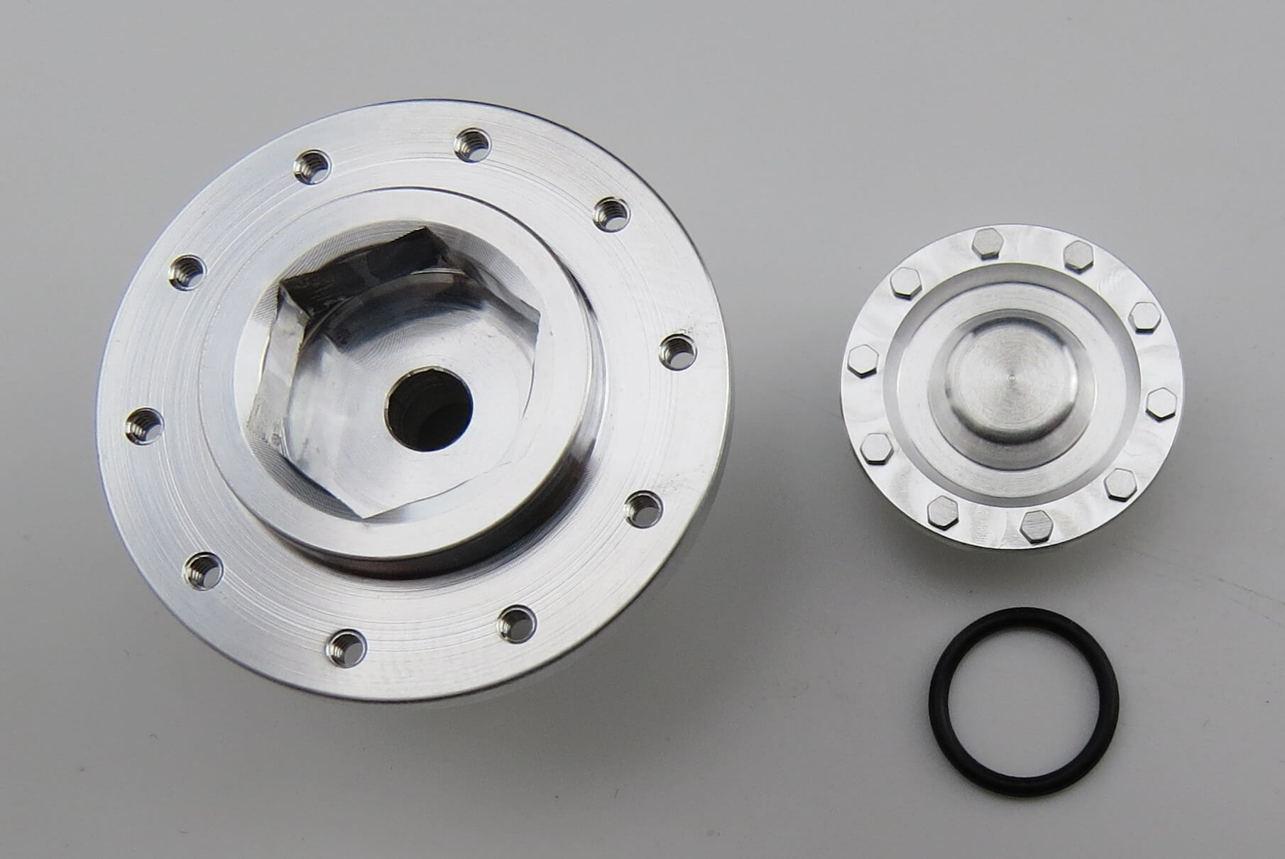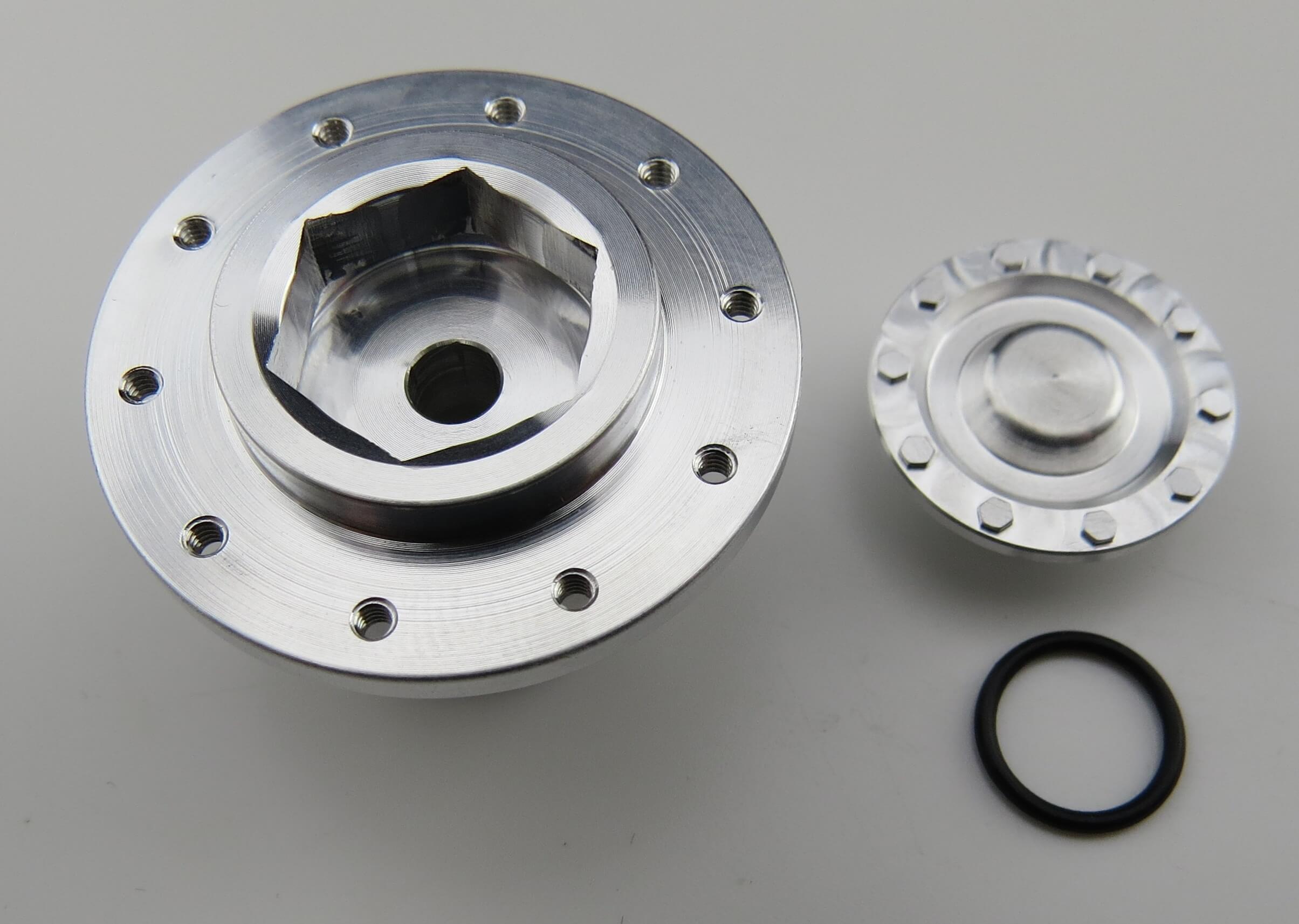 Hinterradnabe mit Deckel, Alu, Lochkreis 25mm, 10x M1,6-Gewinde. Für RÜST-Felgen. Mit Alu-Nabendeckel, O-Ring. Tamiya-. Größe (14010). Außendurchmesser des Nabendeckels: 17,8mm.