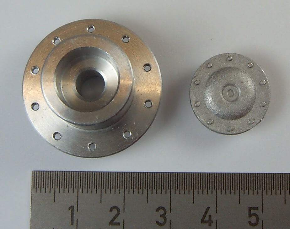 Hinterradnabe mit Deckel, Alu, Lochkreis 25mm, 10x M1,6-Gewinde. Für RÜST-Felgen. Mit Feinguss-Nabendeckel. Tamiya-Größe. (14011). Außendurchmesser des Naben- deckels: 17,8mm.