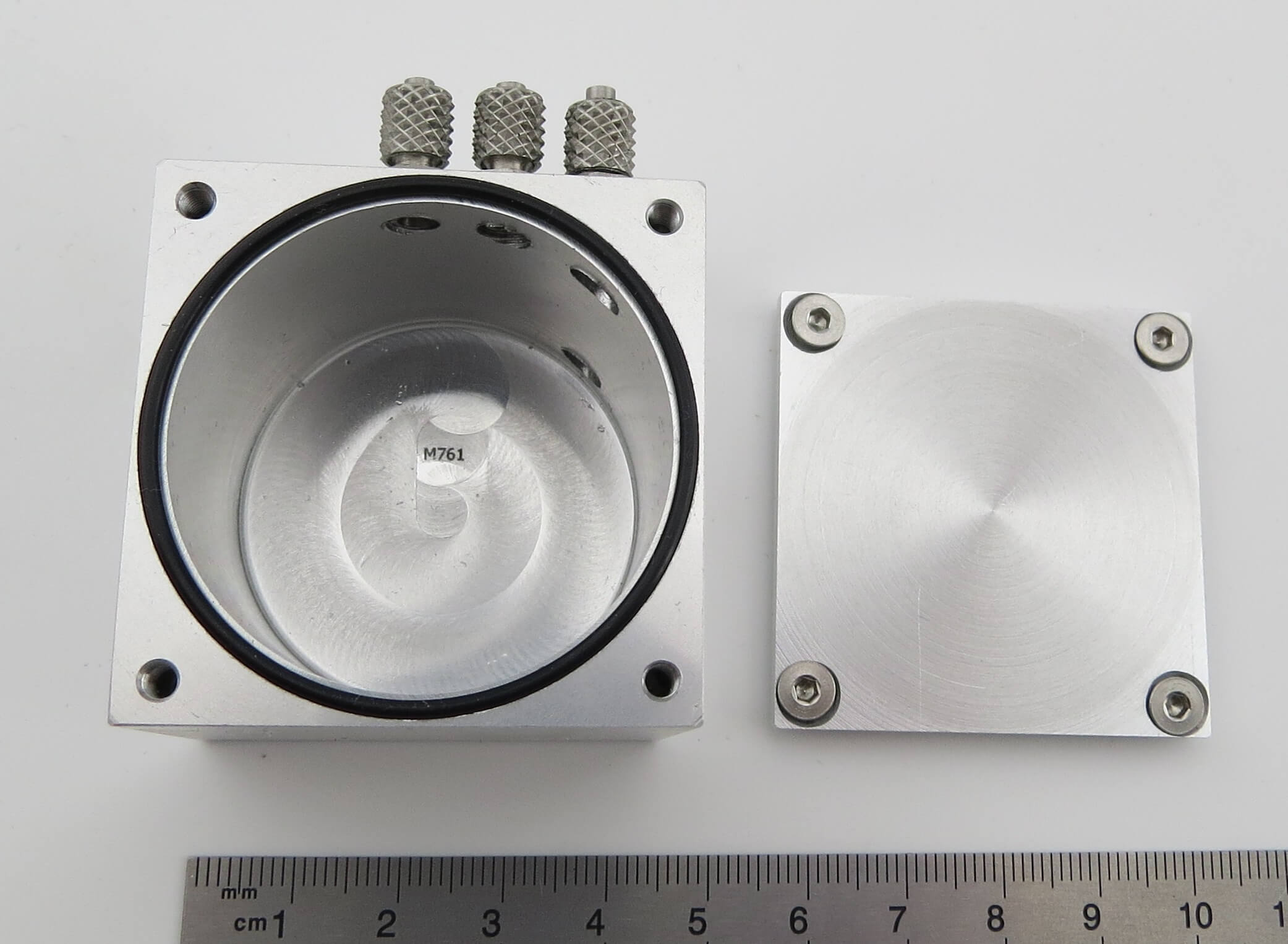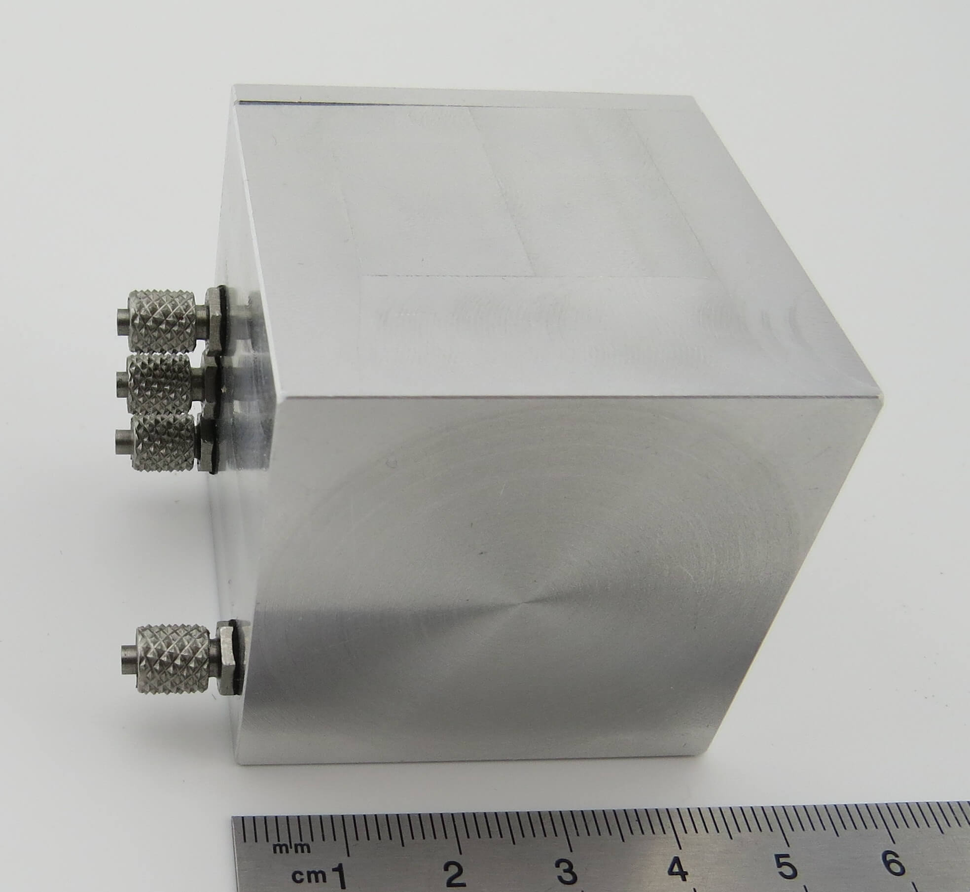 1 Hydrauliktank aus Alu. Würfelform mit 45x45x45mm Außenmaß. Mit 4 geraden Anschlußnippeln für 4/2,5mm-Schlauch und 4 Überwurf-Muttern. Mit einseitig verschraubtem Deckel. Ca. 50cbcm Inhalt.